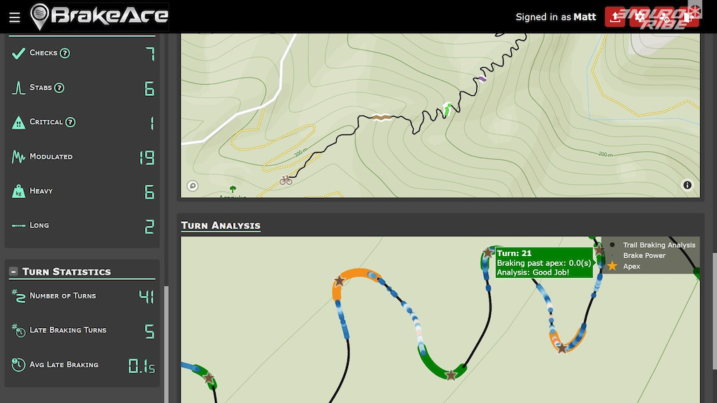 À moins, justement, qu’un travail de développement ait été mené pour rentre les données intelligibles. C’est toute l’ambition de l’app BrakeAce ! Différentes courbes brutes, puis des retours en matière de durée, intensité et modulation du freinage, avant le clou du spectacle : une cartographie qui renseignerait, à chaque virage, sur ce que l’on a fait, et ce que l’on peut faire de mieux pour ne plus jamais dépasser le point de corde au freinage..! Si ça marche, on prend !