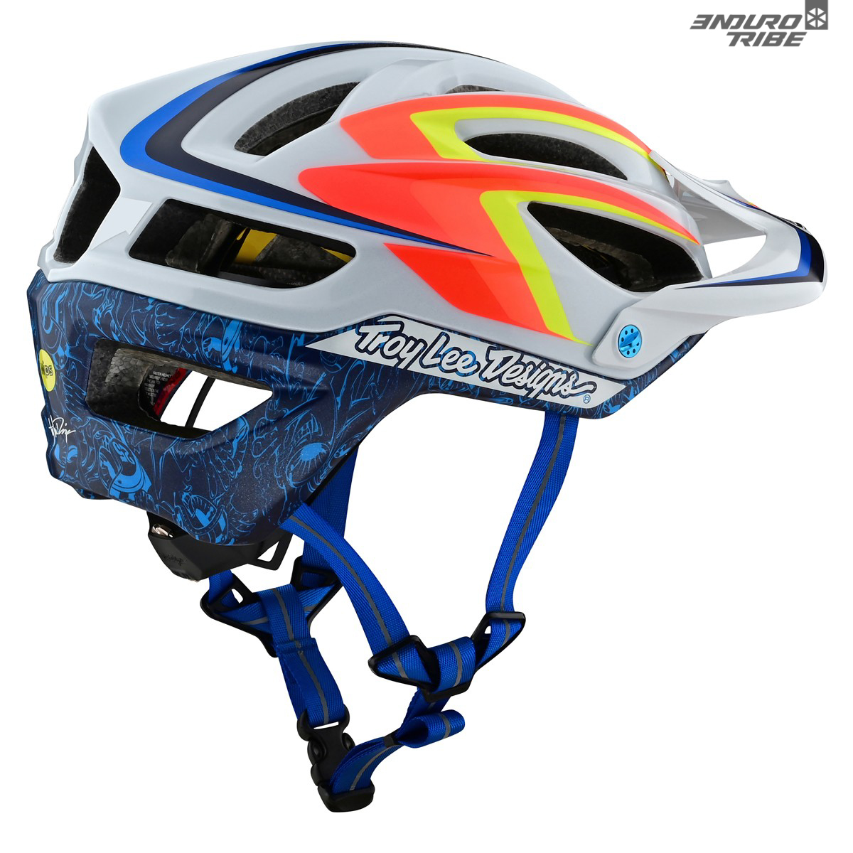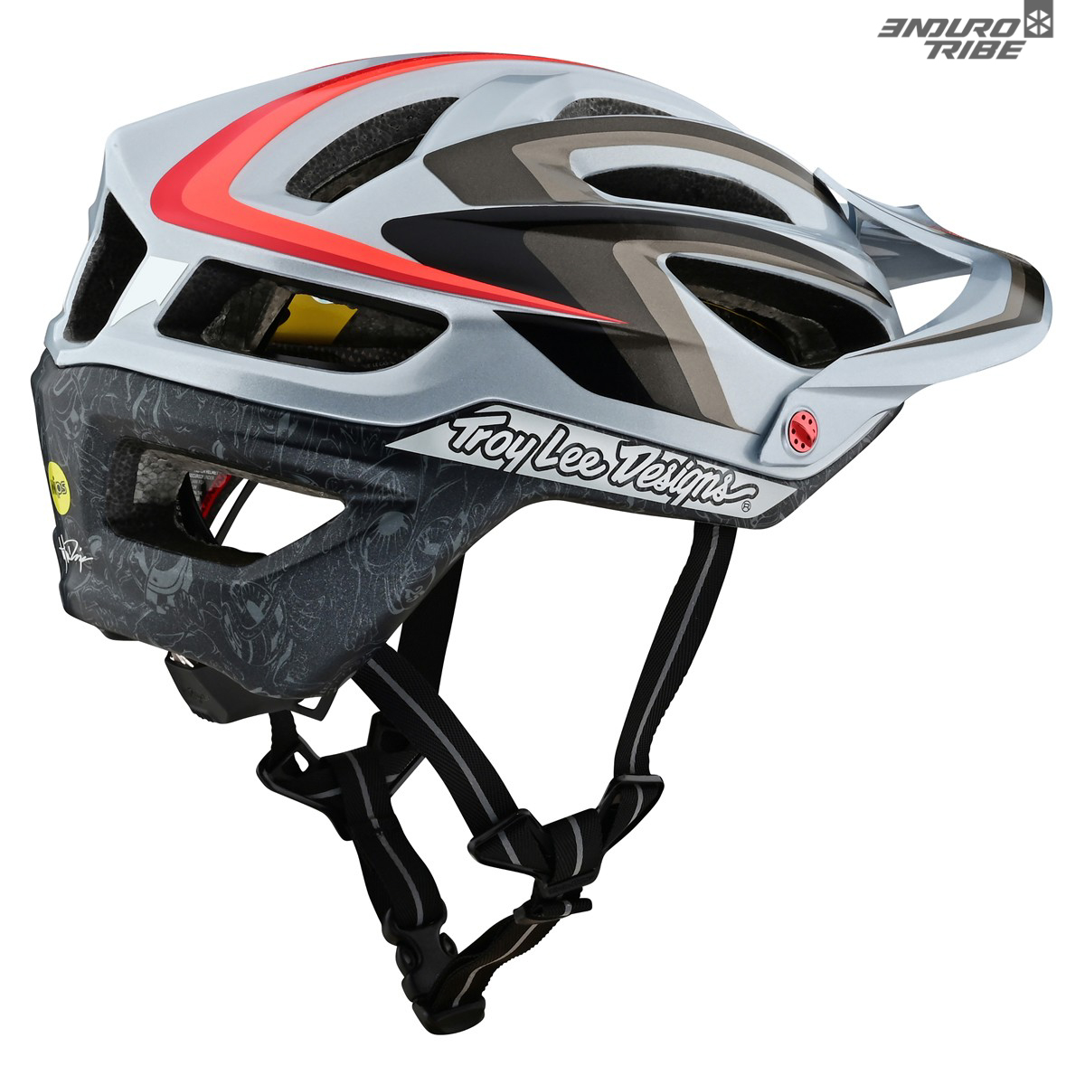 L’autre modèle de la collection, le Mirage, fait lui référence aux graphismes du Troy Lee Design Edge. Pour rappel, c’était le modèle qui a fait la transition entre casque open face (avec protection faciale ajoutée au masque) et les intégraux à mentonnière, tels qu’on les connait maintenant. Ici, ce sont les lignes particulières, propres au style TLD, qui montrent le A2 sous un genre différent de celui auquel on est habitué. Choli !