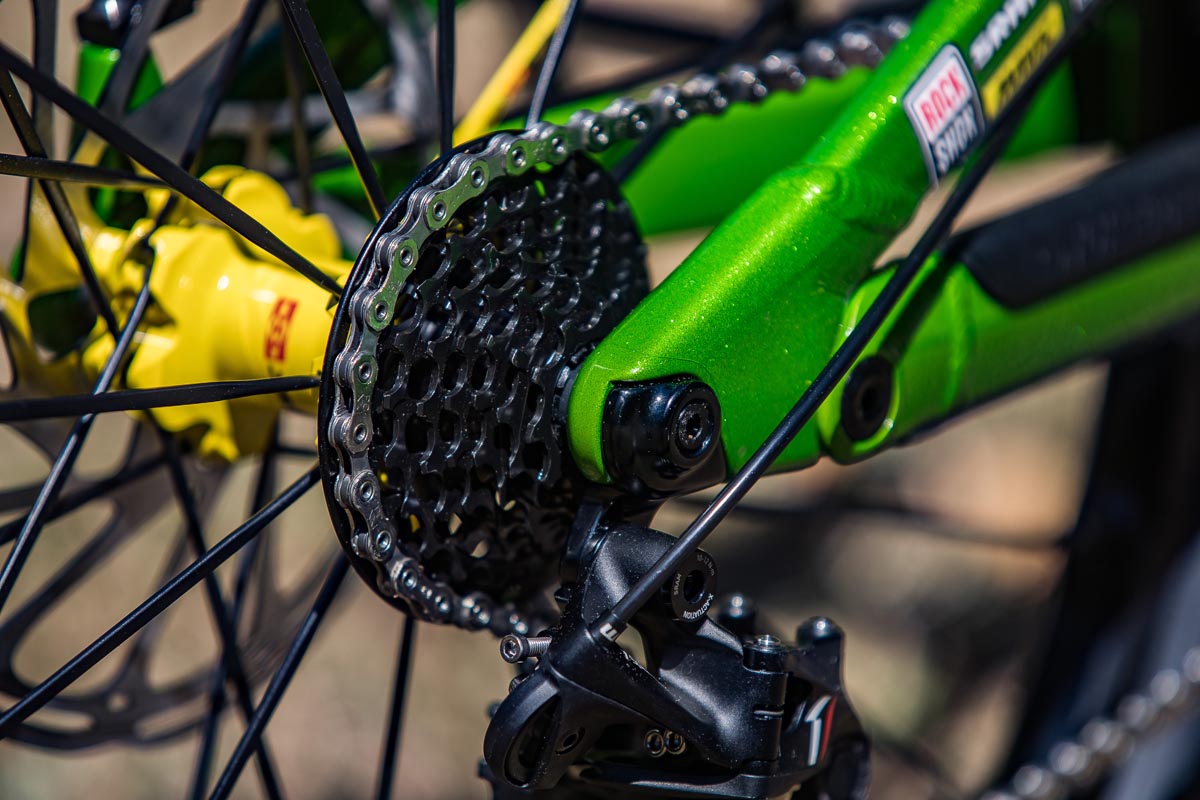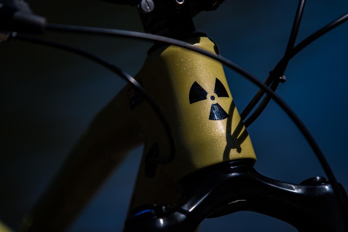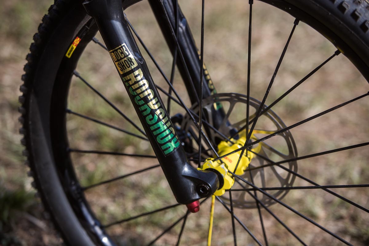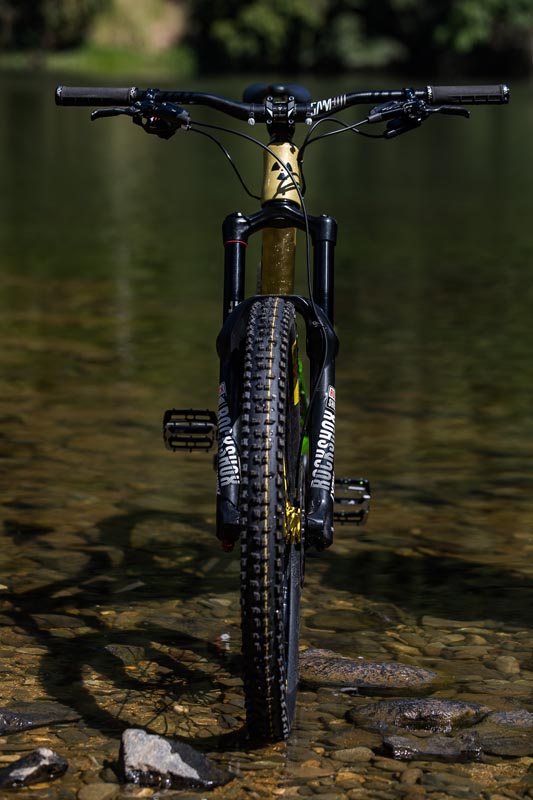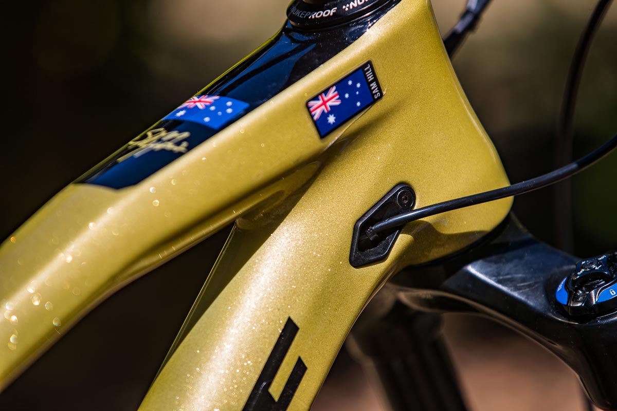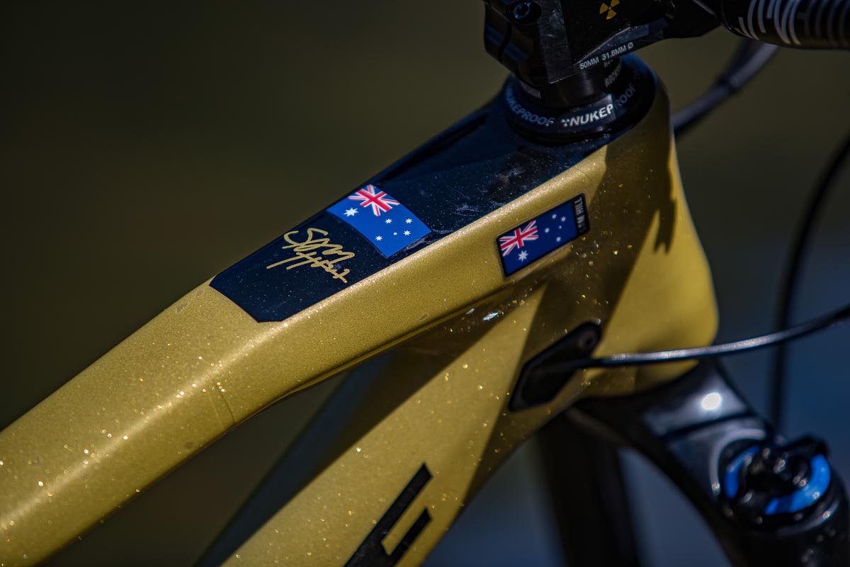 Grâce au remarquable boulot des gars de Refurbmybike à Belfast, le vélo arbore les couleurs nationales aussies couplées à la panoplie de composants Enduro classique du pilote australien : fourche Lyrik, amortisseur Super Delux (type metric), tige de selle RockShox Reverb avec la commande 1x, roues Mavic Deemax et bien sûr, des pédales plates Sam Hill Signature…