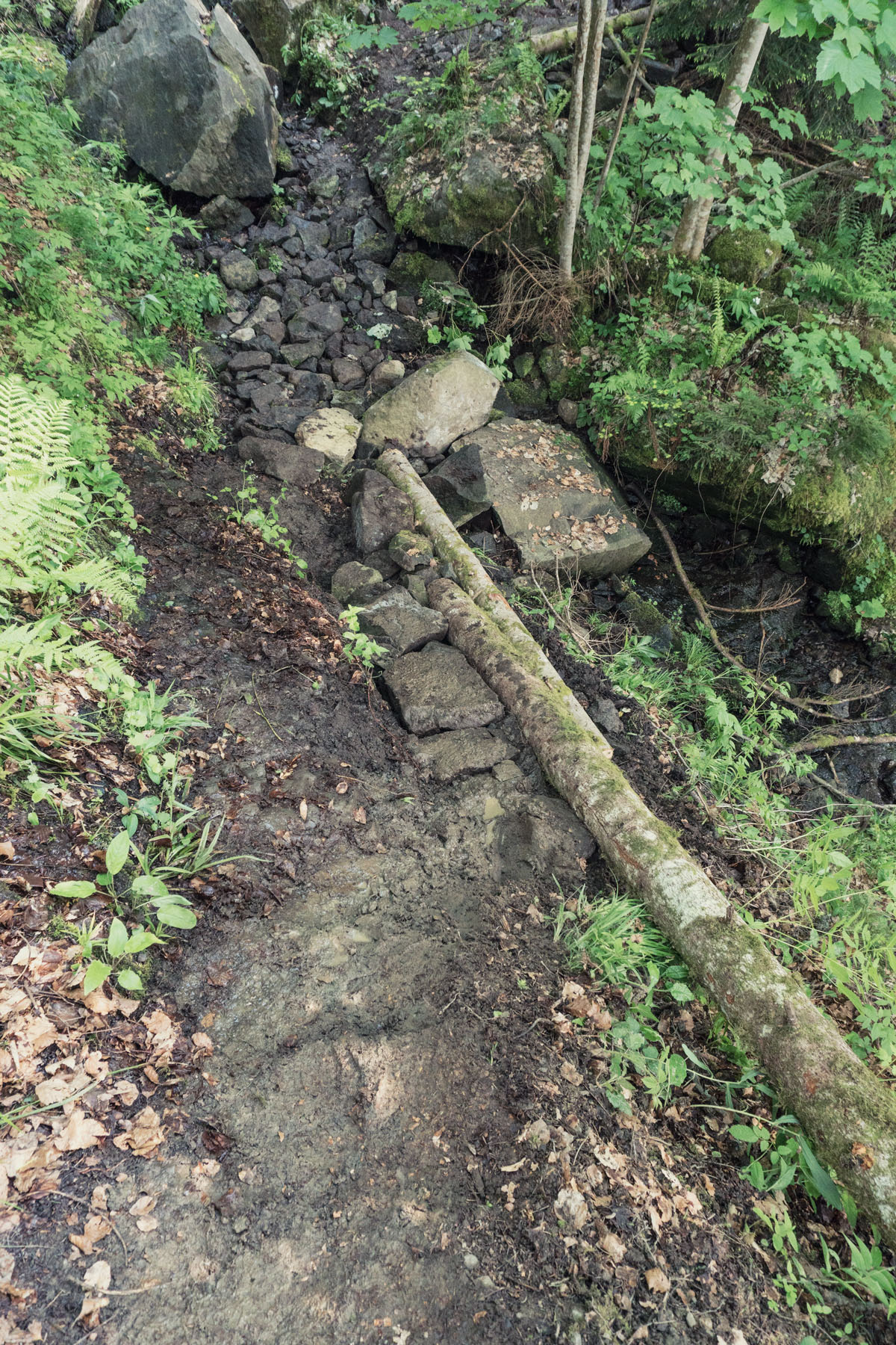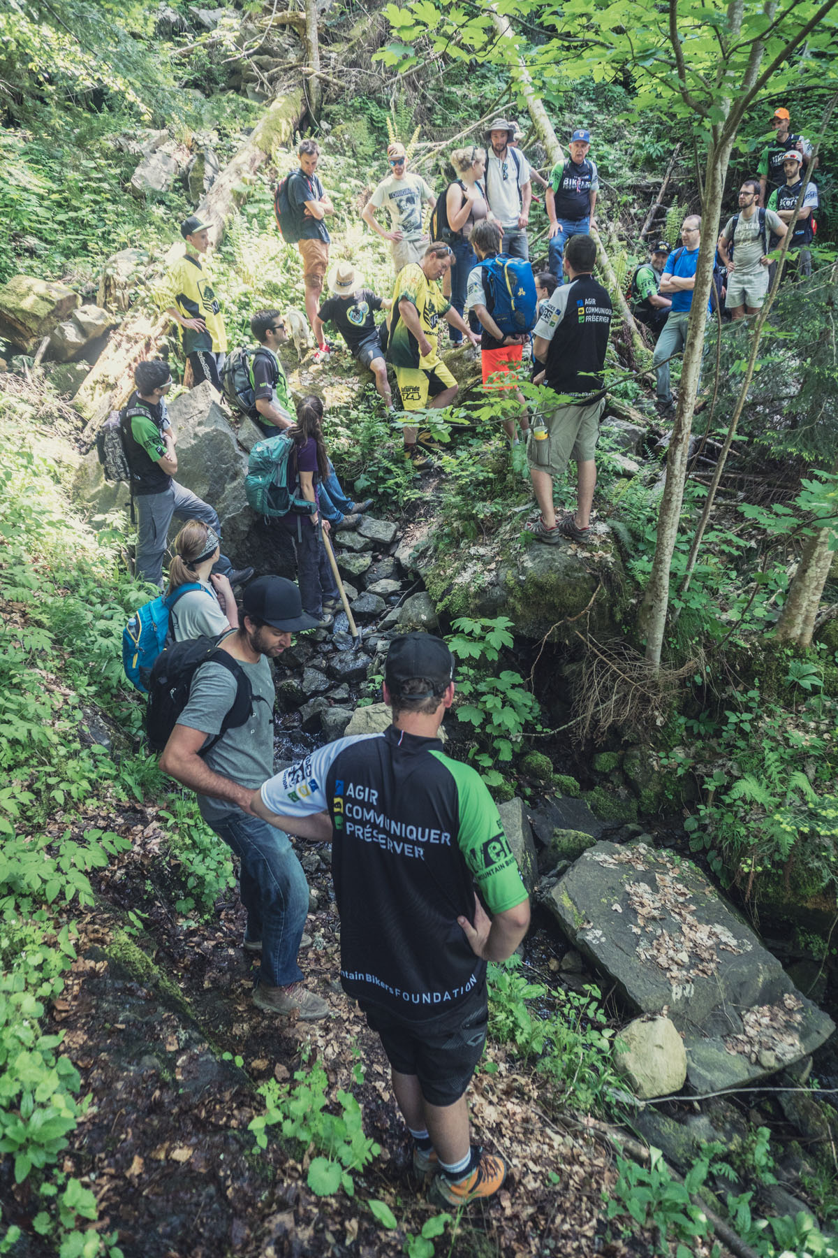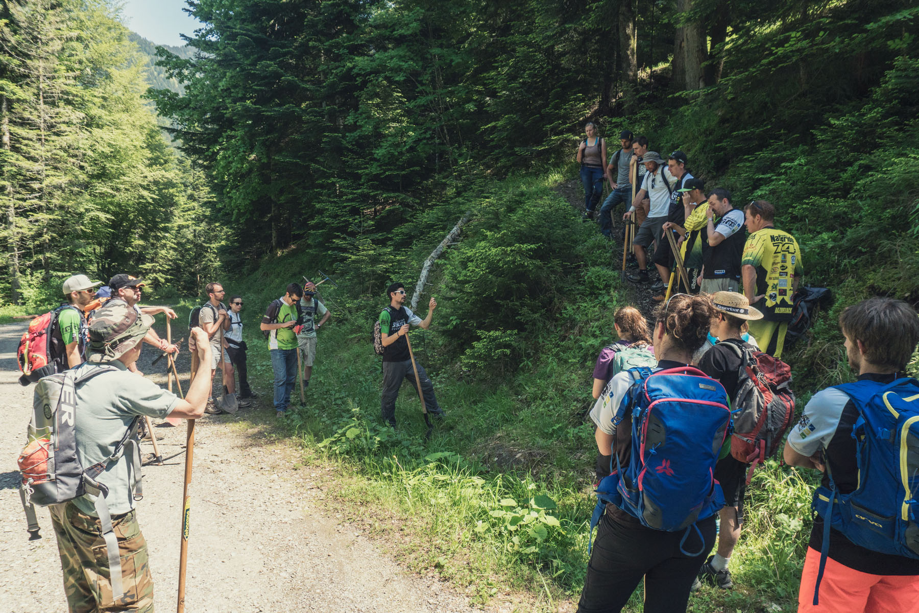 J’ai ensuite pris le relais pour nous emmener sur le sentier que j’avais repéré pour la partie « mise en pratique ». Nous avions évidement demandé les autorisation à la communauté de commune des Vallées de Thônes pour entretenir ce sentier particulièrement dégradé. C’est un vieux sentier qui relit deux points stratégiques de la vallée, et potentiellement un super ride.