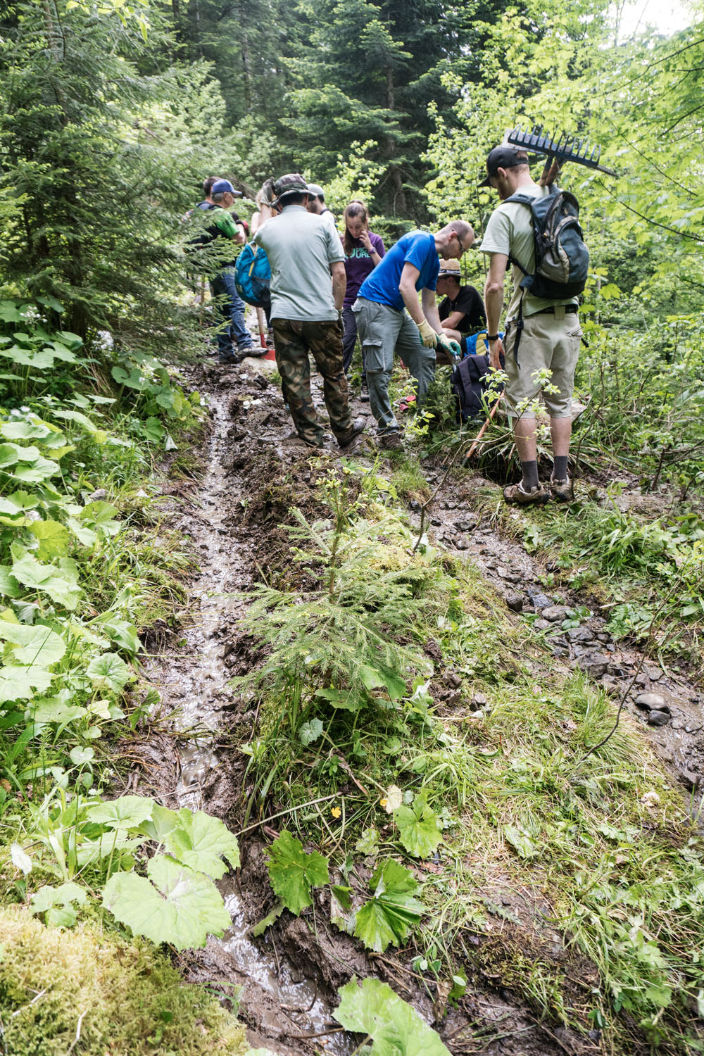En fin de journée nous avons pu observé un cas « classique » d’érosion sur un sentier devenu détrempé par le passage de l’eau. Hans nous a donné les différentes techniques à utiliser près de chez nous pour gérer ce type de problème.