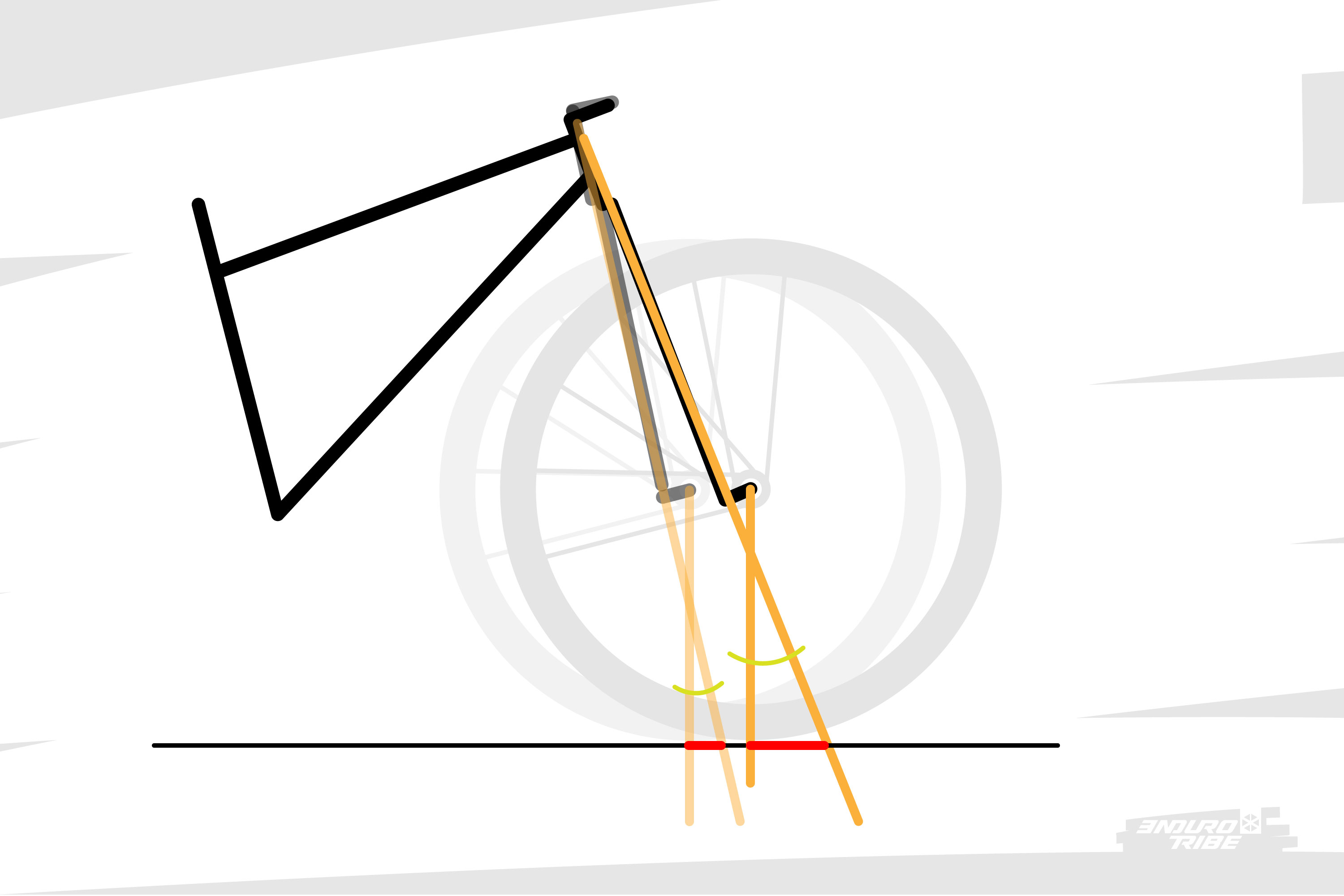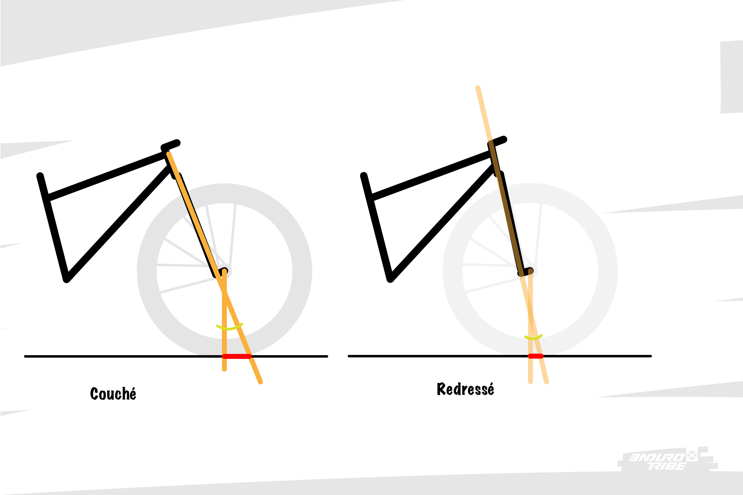 Plus l’angle de direction est verticale, plus la plongée est facilitée, et a un impact important sur l’assiette du vélo, au risque d’avoir l’impression que la roue avant passe sous le cadre.