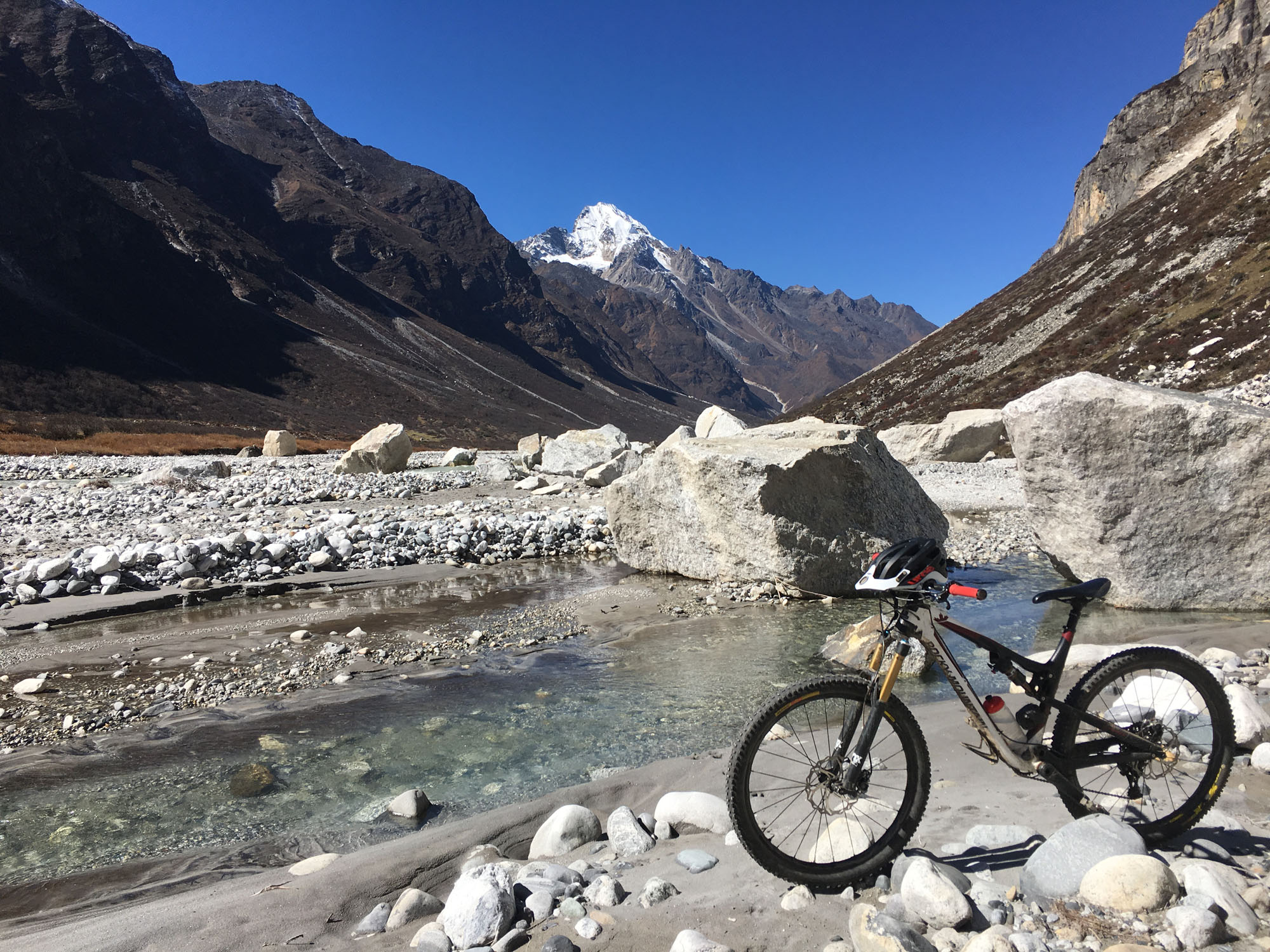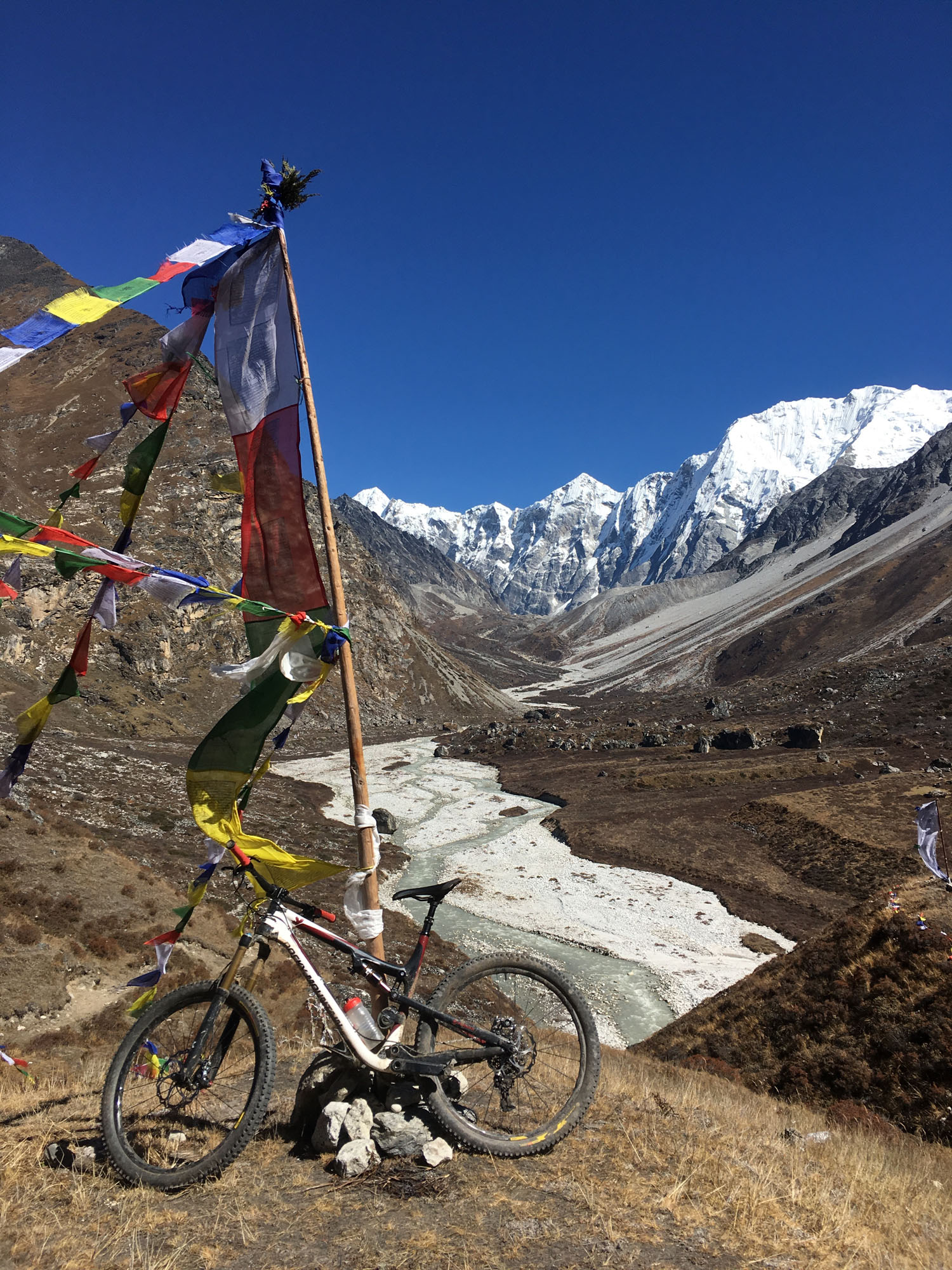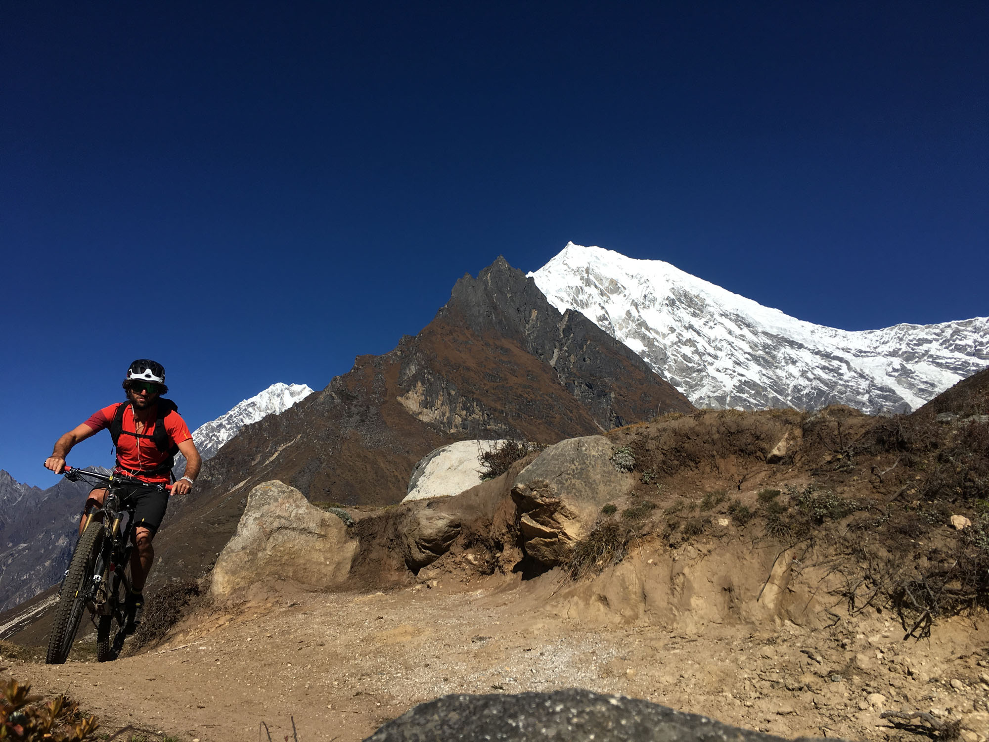 Le projet initial était de tenter la plus grande distance sur le Great Himalaya Trail Népalais, un sentier parcourant la chaîne intégralement d’Est en Ouest. Mais les conditions dans la région de l’Everest étaient si incertaines que pour des raisons de sécurité j’ai décidé d’emprunter l’itinéraire bas pour cette région. En effet le tracé original passe sur des glaciers et emprunte des cols au-dessus de 5300 mètres, il était impossible d’avoir des informations fiables sur la faisabilité à vélo.