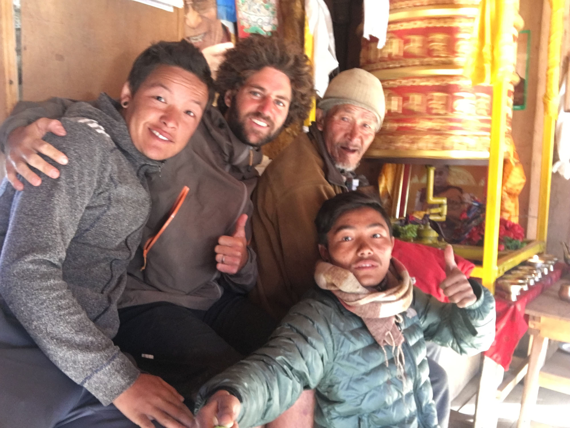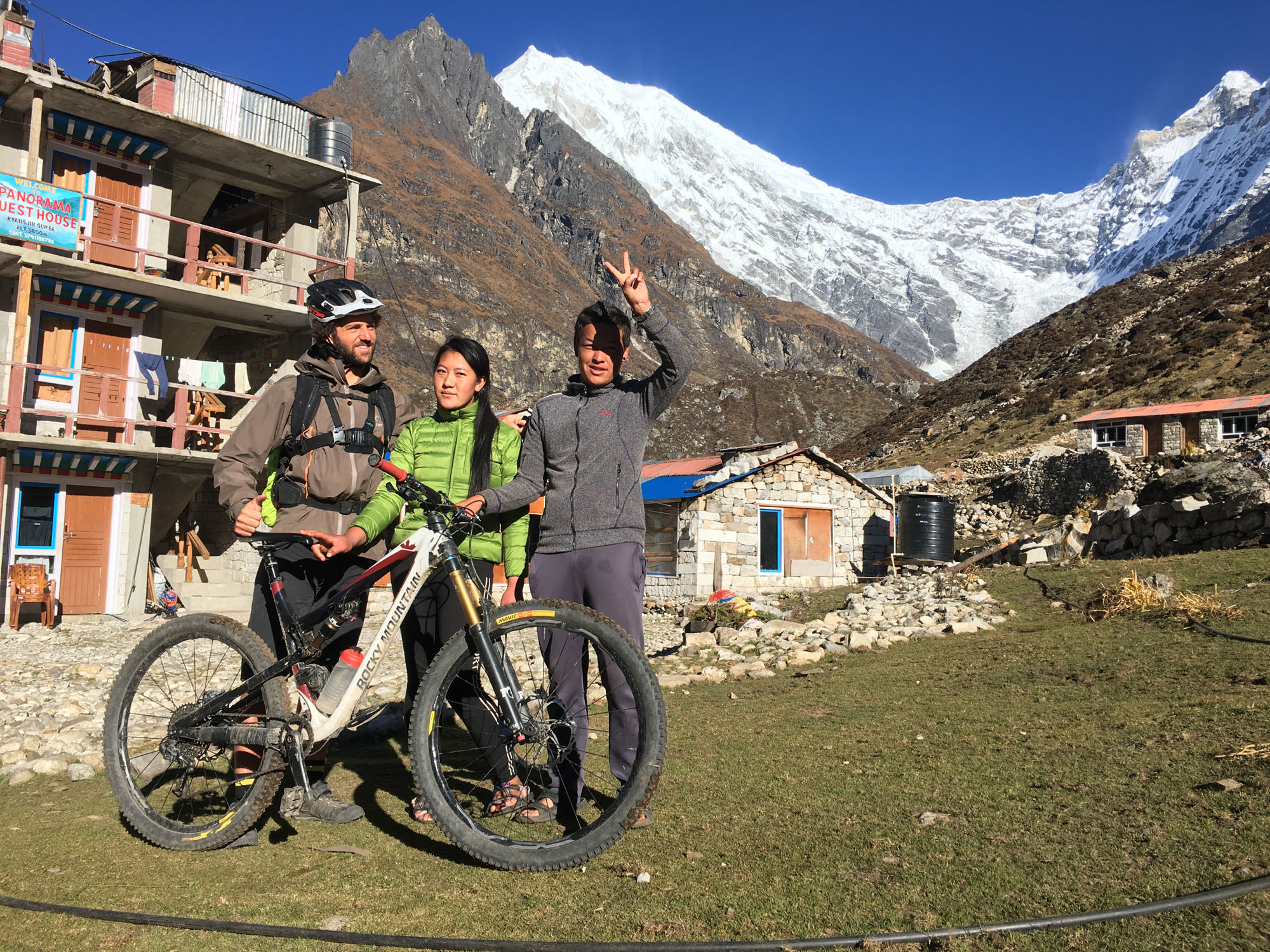 Le village domine la rivière entourée de grands prés verts où pâturent chevaux et yaks, alors que tout autour les sommets et glaciers terminent ce paysage majestueux. Le plus proche et le plus haut est le Langtang Lirung, culminant à 7234 mètres ; c’est une montagne magnifique et terrifiante, qui a fait beaucoup de morts. Ces montagnes ne peuvent inspirer qu’un seul sentiment, l’Humilité. Je reste quelques jours pour rouler et profiter, c’est géant. L’après-midi je mange des gâteaux et bois du thé en discutant avec des tas de gens différents.