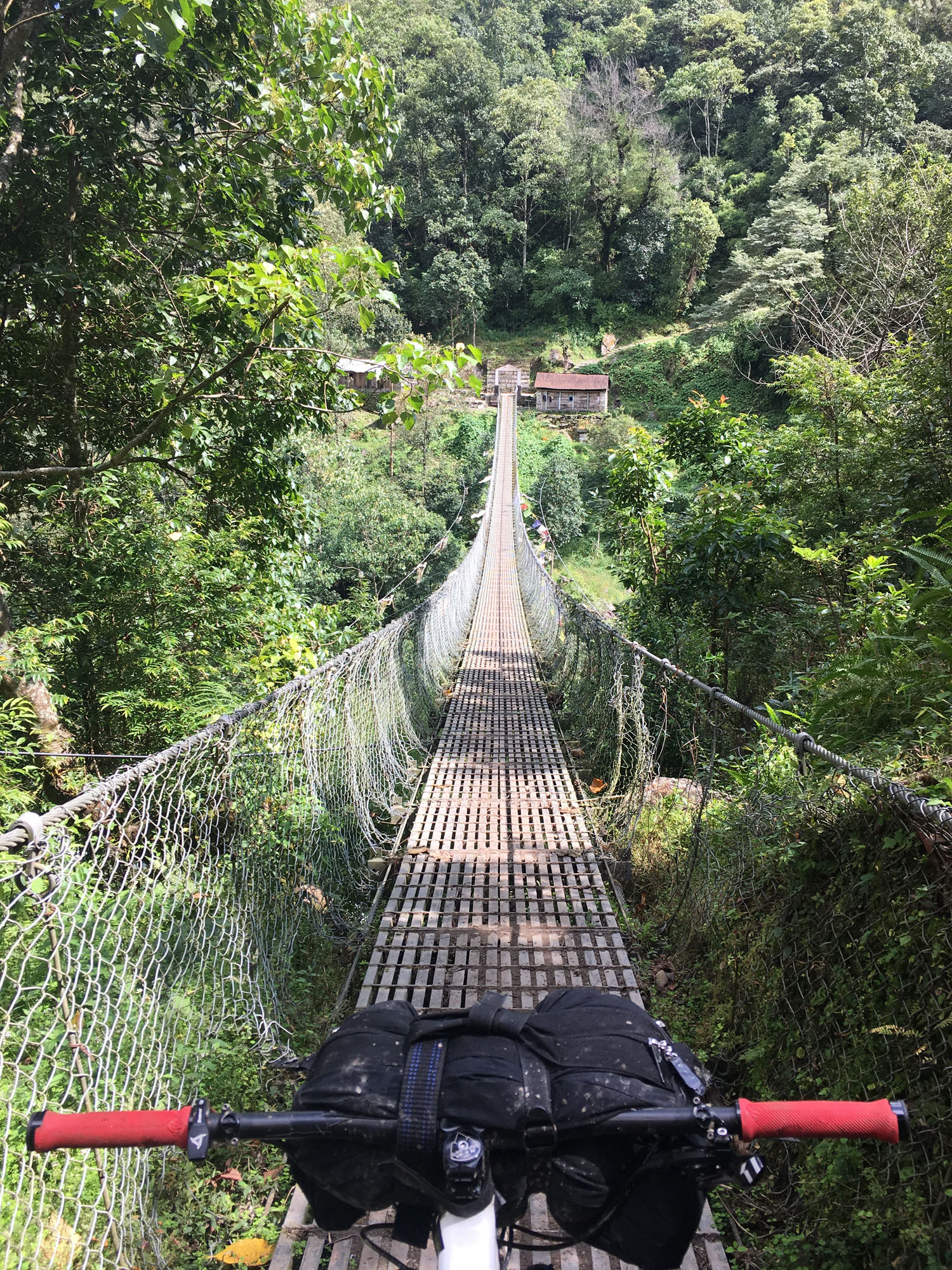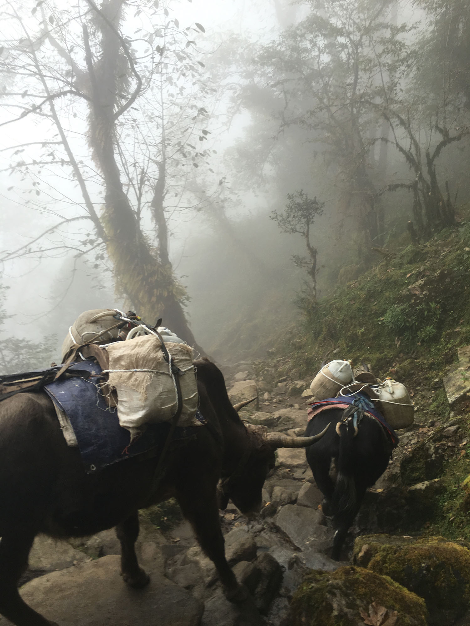 En arrivant à Dhunche je décide d’attaquer avec le trek de Gosainkund pour aller voir la vue depuis 4000 mais la pluie en décide autrement et je plonge de Laurebina à Bamboo pour une descente glissante de 2250 mètres, les locaux qui me voient passer rigolent bien en me voyant glisser et lutter couvert de boue. Moi aussi je rigole bien et c’est toujours intéressant d’expliquer ma passion au gens. La descente était vraiment super, depuis la limite des arbres elle traversait une épaisse forêt pour ensuite rallier les quelques champs et communautés qui vivent ici. Avant d’arriver dans la forêt plus tropicale où se succèdent les escaliers de pierres et les ponts suspendus. Impossible de se sentir perdu ici, même quand je crois qu’il n’y a personne il suffit d’attendre un peu et quelqu’un va venir, une petite dame avec ses bêtes, un bûcheron, des ânes ou même des yaks. Et au coin d’un sentier on trouve souvent une stuppa et des drapeaux de prières, cette ambiance et cette vie sont vraiment uniques pour moi. Rendant les montagnes plus spirituelles et le voyage plus profond.