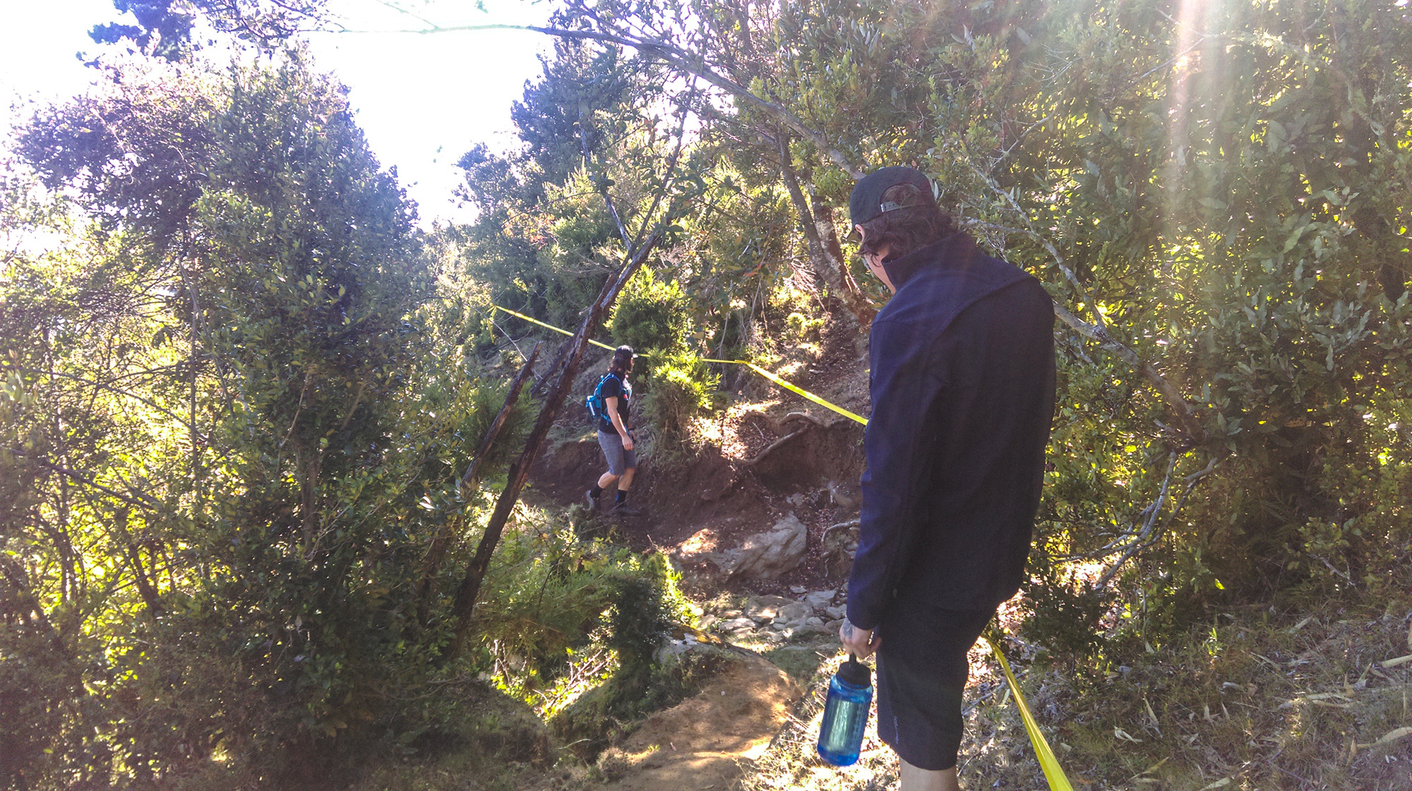 L’arrivée de cette spéciale est très engagée et pentue ! Le terrain est très sec et on a quelque peu l’impression d’être dans l’Estérel… On continue à remonter la piste, chacun à sa technique pour la reco à pied, Bryan mémorise beaucoup et prend quelques photos des points-clés, Yo note tout à la manière d’un pilote de rallye automobile. A chacun sa méthode. Après cette première partie très raide et assez étroite, nous arrivons dans un genre forêt primaire, assez sombre, avec de grands virages pas facile à ouvrir… Nous continuons à monter et nous retrouvons une portion très rapide où il faudra pas mal pédaler mais ça passera très vite en course ! Sur le haut de la spéciale, on est dans les eucalyptus, le terrain est toujours très sec et le tracé rapide avec, de ci de là, de gros blocs de pierre.