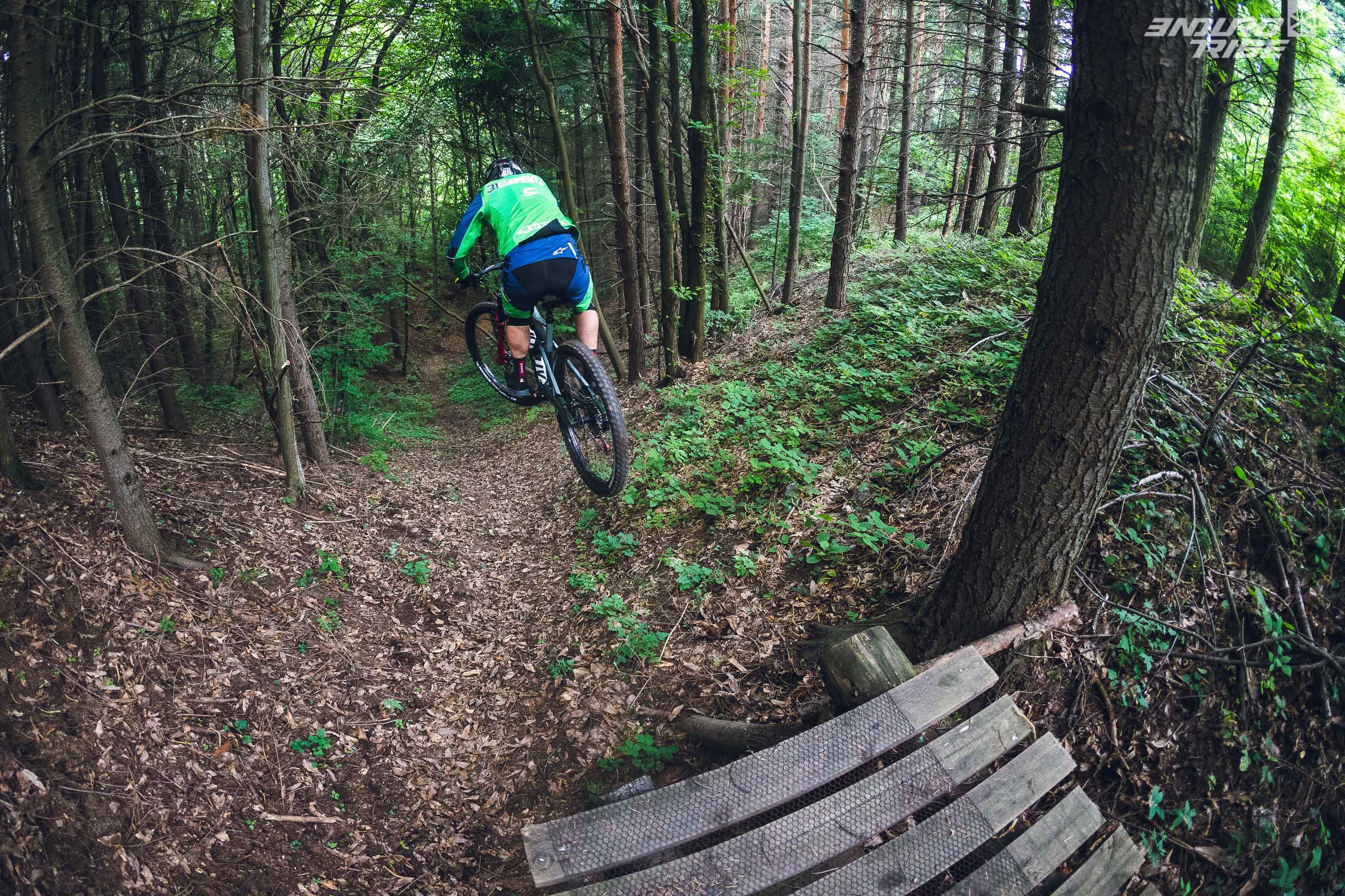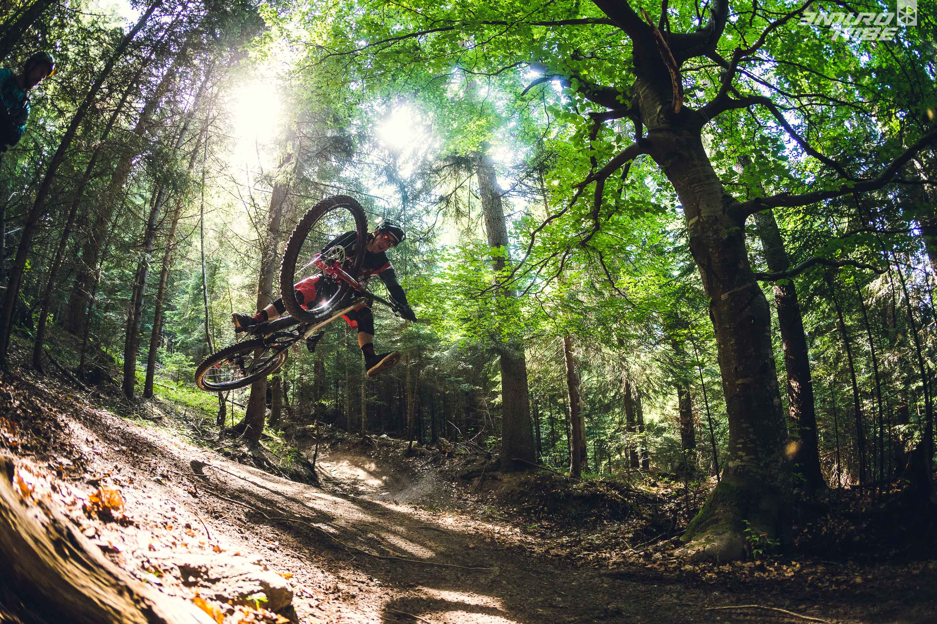 Après 15 minutes de descente, on entre dans la forêt, le flow devient meilleur et la vitesse augmente. Il n’y a pas eu beaucoup de passage, le sol est meuble, les pommes de pins nous mettent de travers et on s’amuse avec le terrain. Une petite remontée nous amène sur le Bike Park, nous avons la bonne surprise de trouver une piste fraîchement tracée avec des sauts, des relevés et une bonne terre. On n’en attendait pas autant et on s’envoie directement dedans, en sautant la moindre bosse ou le moindre module. On devient même créatif avec des mouvements freestyle sur les côtés et le sourire apparaît naturellement sur nos lèvres.