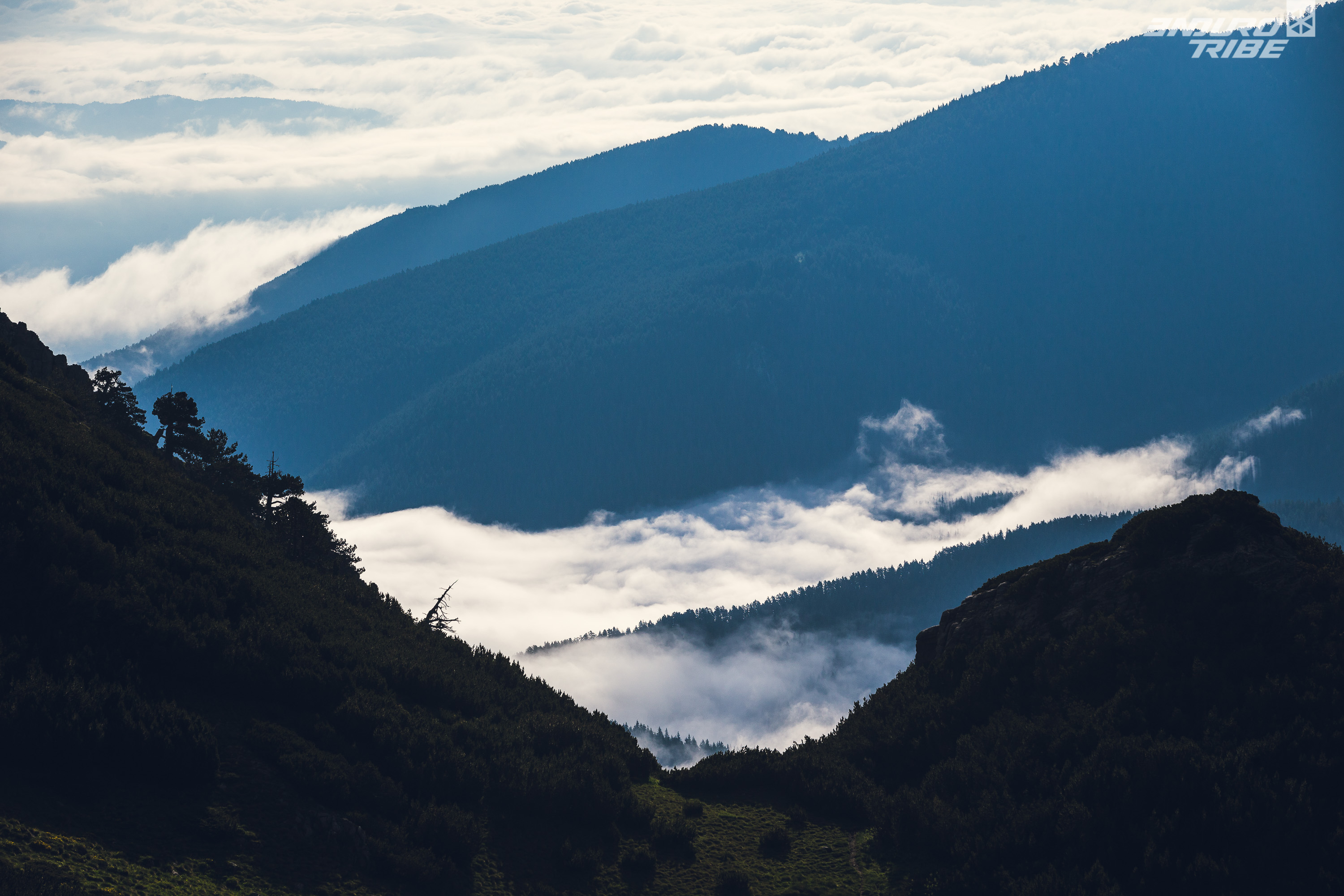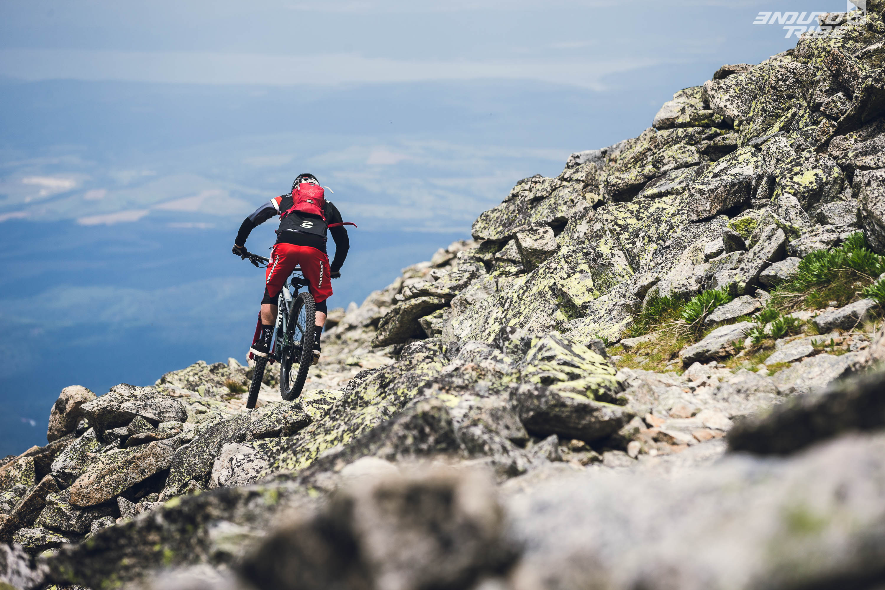 Nous sommes à la limite de la végétation et les moraines d’un ancien glacier avec une vue sur Borovets et Sofia au loin. Le trail est bien technique avec de gros rochers et une sorte de pin, typique de Bulgarie, qui pousse plus en largeur qu’en hauteur. Dans ces conditions la vitesse n’est pas très élevée mais le défi est de trouver la ligne la plus propre et ne pas poser de bien au sol, ni de se prendre le guidon dans une branche de pin et finir KO dans les rochers.