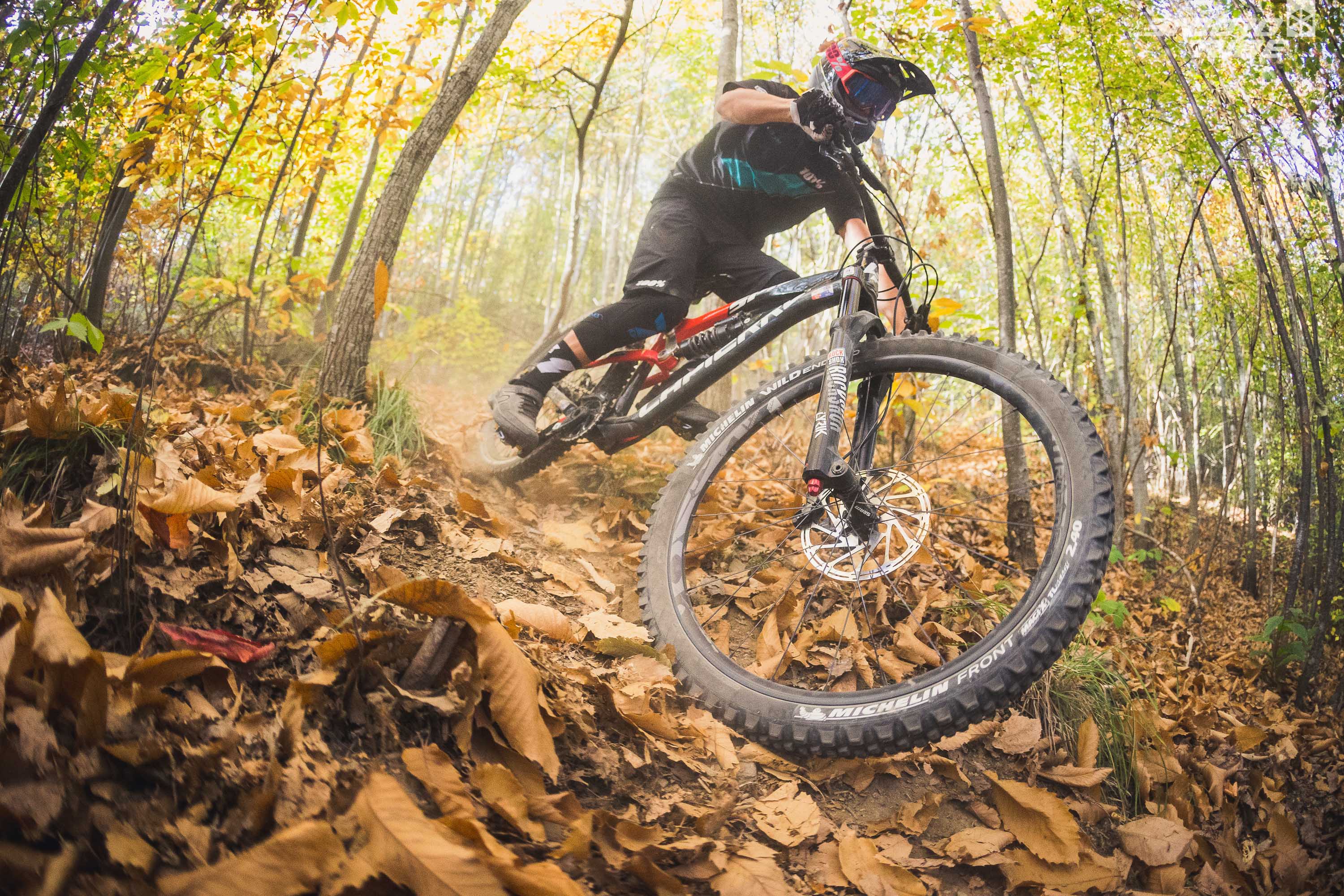 À l’avant, la carcasse s’inspire des pneus All Mountain présentés au printemps dernier. Comprenons que sous l’appellation Gravity Shield, le Michelin Wild Enduro Front se compose de 3 plis en 60TPI complétés d’une couche de fibre à haute densité. L’objectif est ici le confort et l’économie de poids.