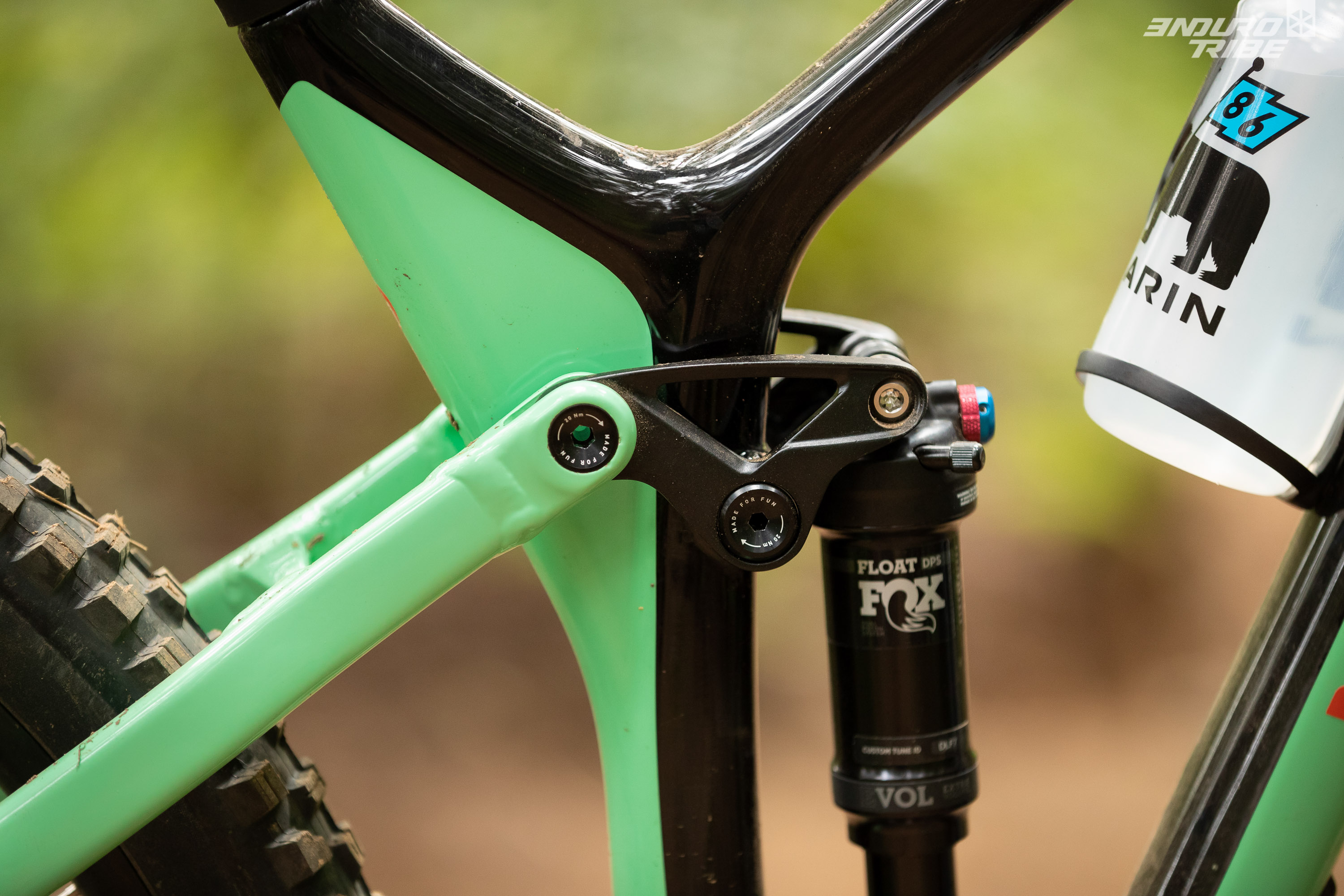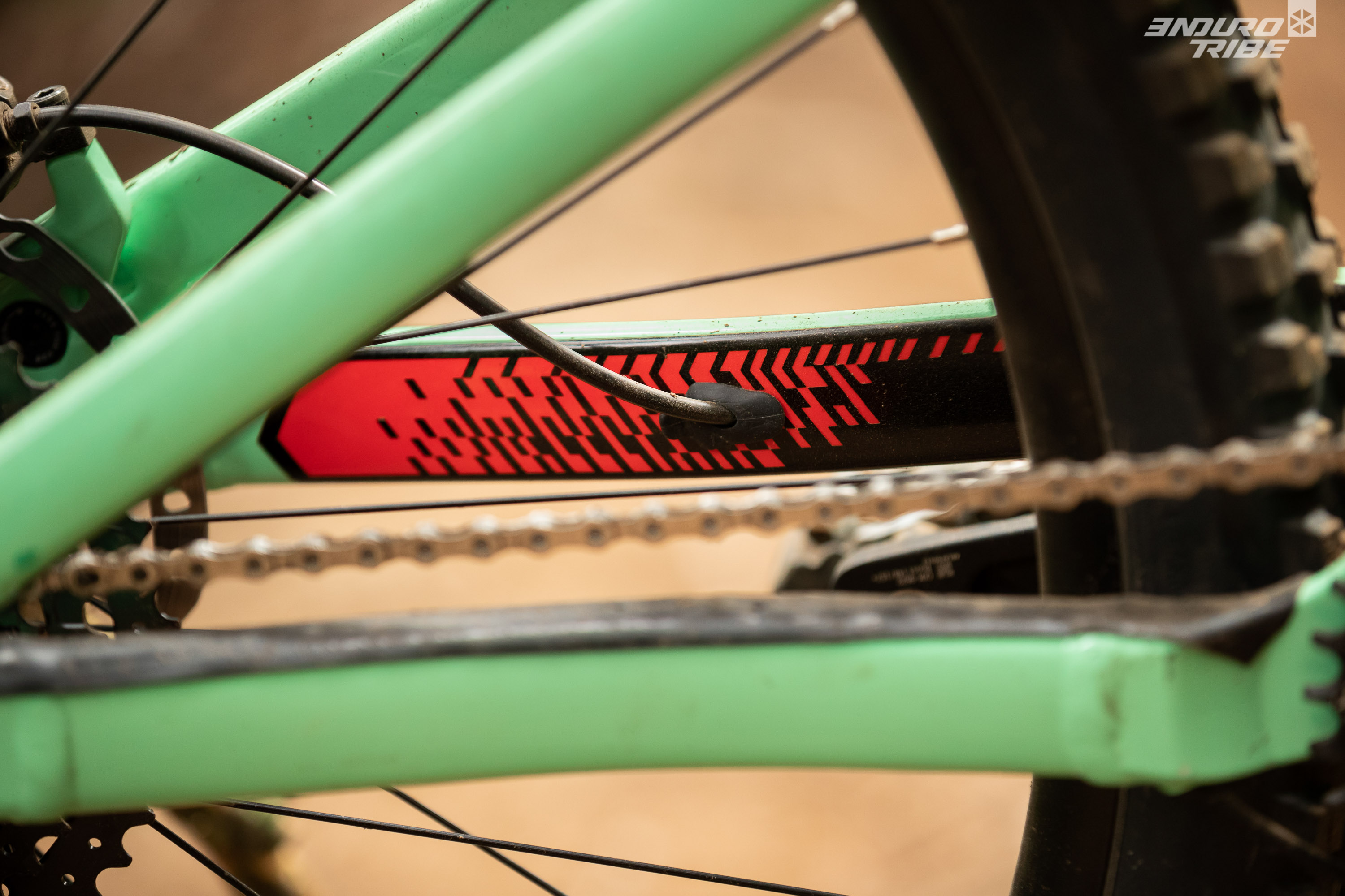D’autre part, aussi étrange que cela puisse paraître, il s’en distingue également par des éléments en alu du cadre : en l’occurrence, les bases ! En effet, les haubans sont strictement identiques, mais les bases ont été retravaillées pour ce nouveau Marin Rift Zone en carbone afin de permettre le passage interne de la gaine de dérailleur et de la durite de frein arrière :
