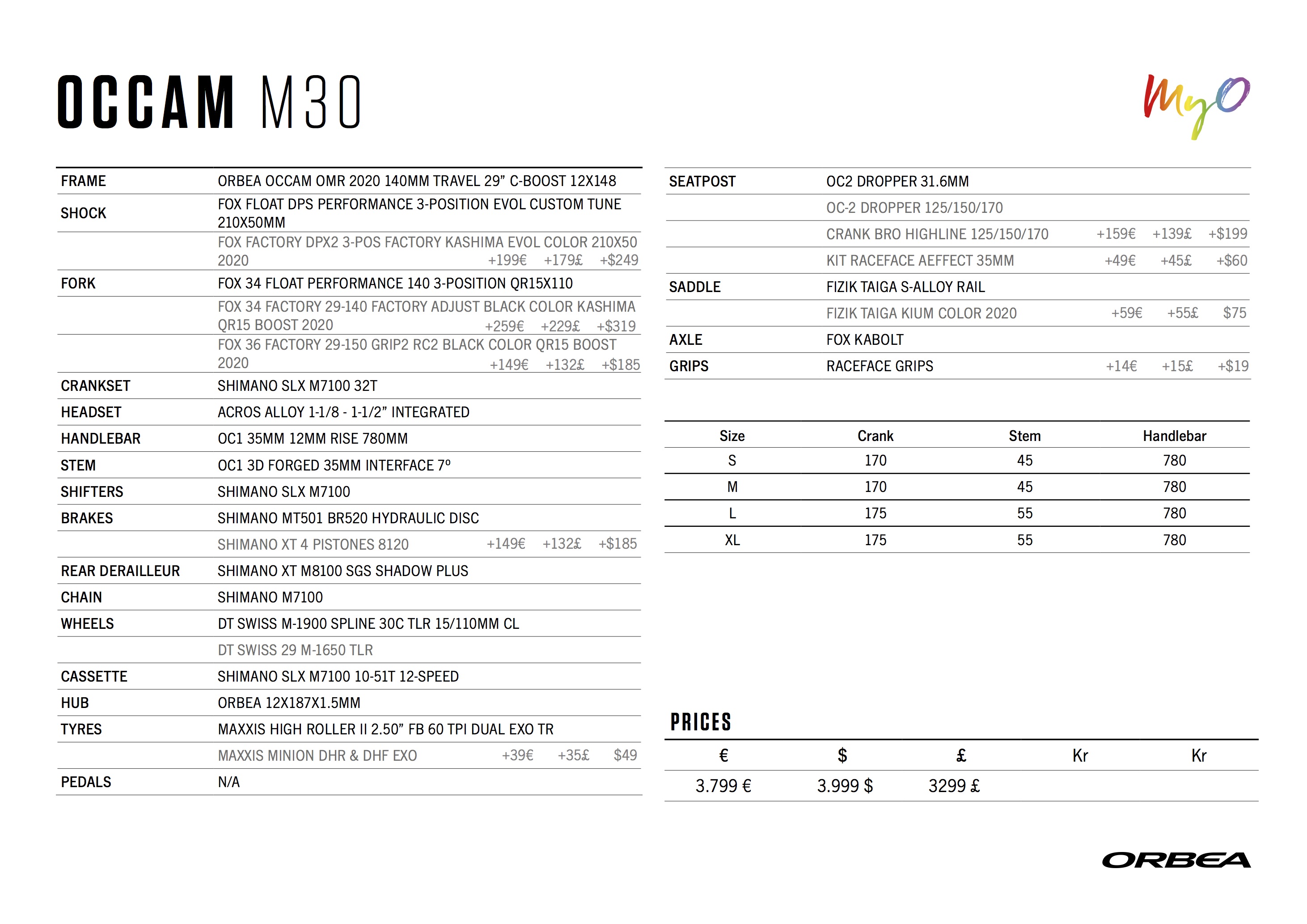 Pour mesurer l’ampleur de ce partenariat, tout comme celui avec Fox, et les options de montage disponibles, voici l’ensemble des specs des modèles bientôt disponible sur le MyO. Deux détails à noter : la Fox 36 qui reste « en option » mais bien là, et l’existence d’une version aluminium plus accessible de cet Orbea Occam nouvelle génération…