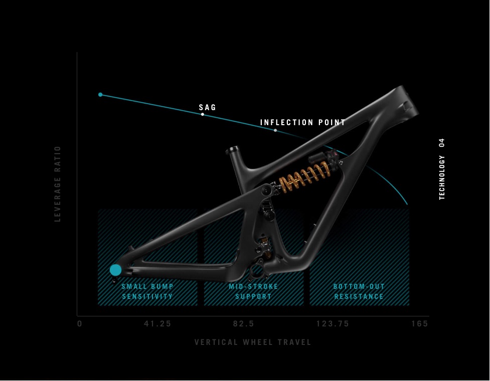 Pour l’usage d’un ressort, la cinématique chère à Yeti se pare donc simplement d’une progressivité plus importante. Entre la valeur initiale du ratio et celle de fin de course, 27,5% d’écart, là où c’est significativement moins d’habitude, avec les amortisseurs pneumatiques utilisés par ailleurs. L’idée ainsi étant de garder la sensibilité légendaire de son système, tout en favorisant un bon maintien à mi-course, et l’absence de talonnage quand on tape au fond… C’est surtout, aussi, l’occasion de démontrer qu’aussi particulier soit-il, le concept de suspension propre à Yeti dispose d’une marge d’exploitation intéressante…