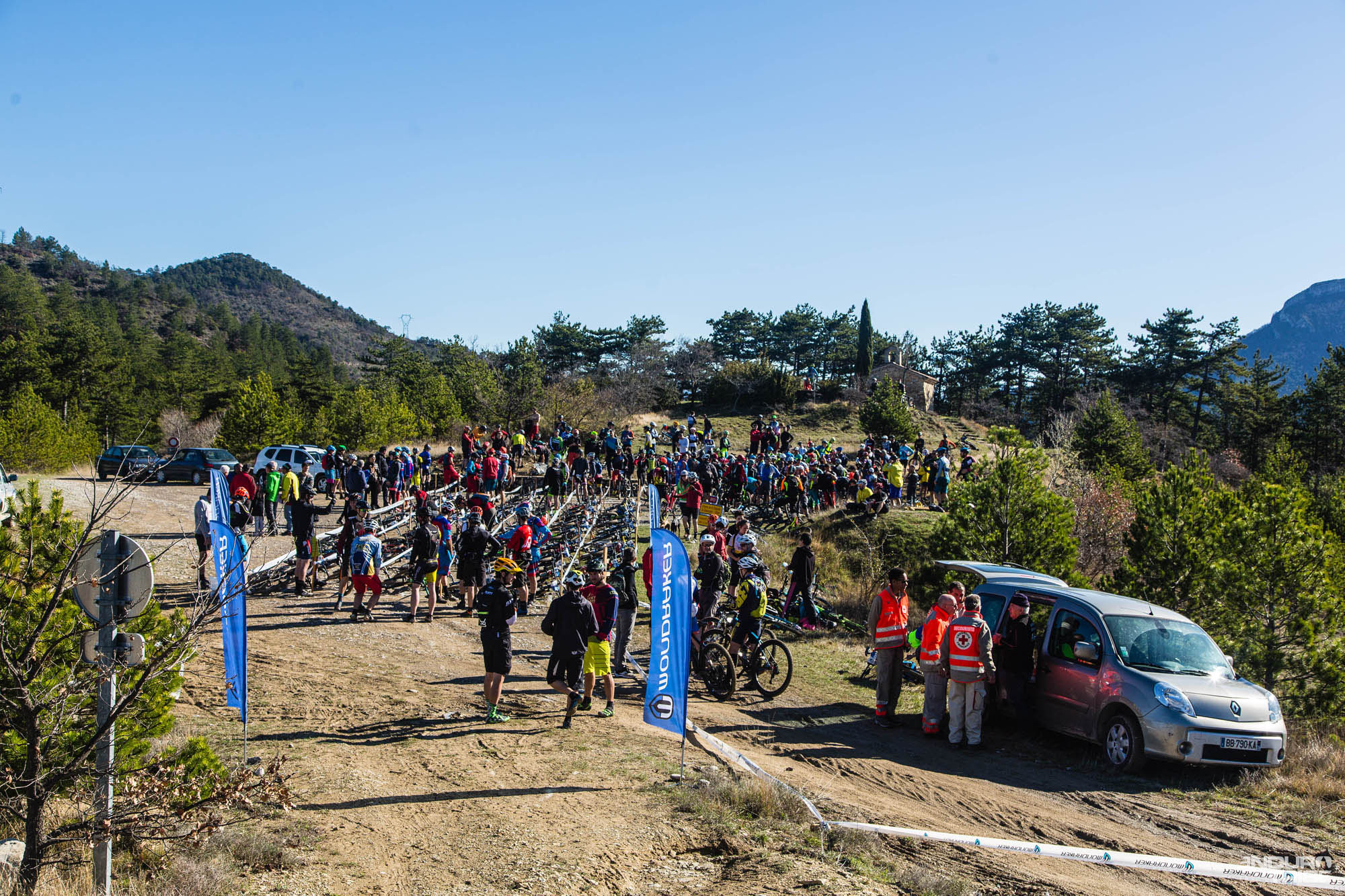 Pour le plus grand plaisir des « rescapés », le brouillard de la veille a laissé place dimanche à une belle vue dégagée sur les Trois Becs. C’est l’heure de la mise en grille après une liaison d’échauffement depuis le centre de Saillans jusqu’à la Chapelle St Christophe.