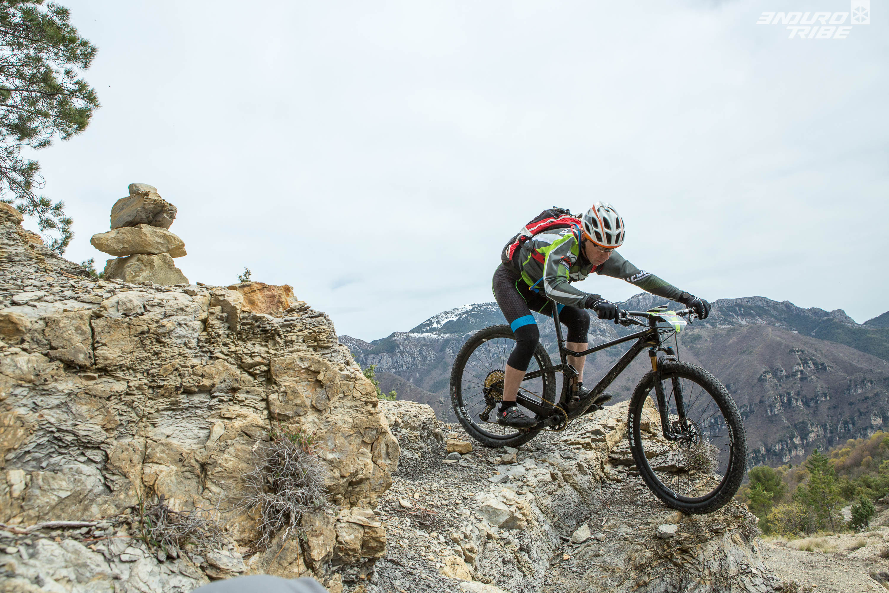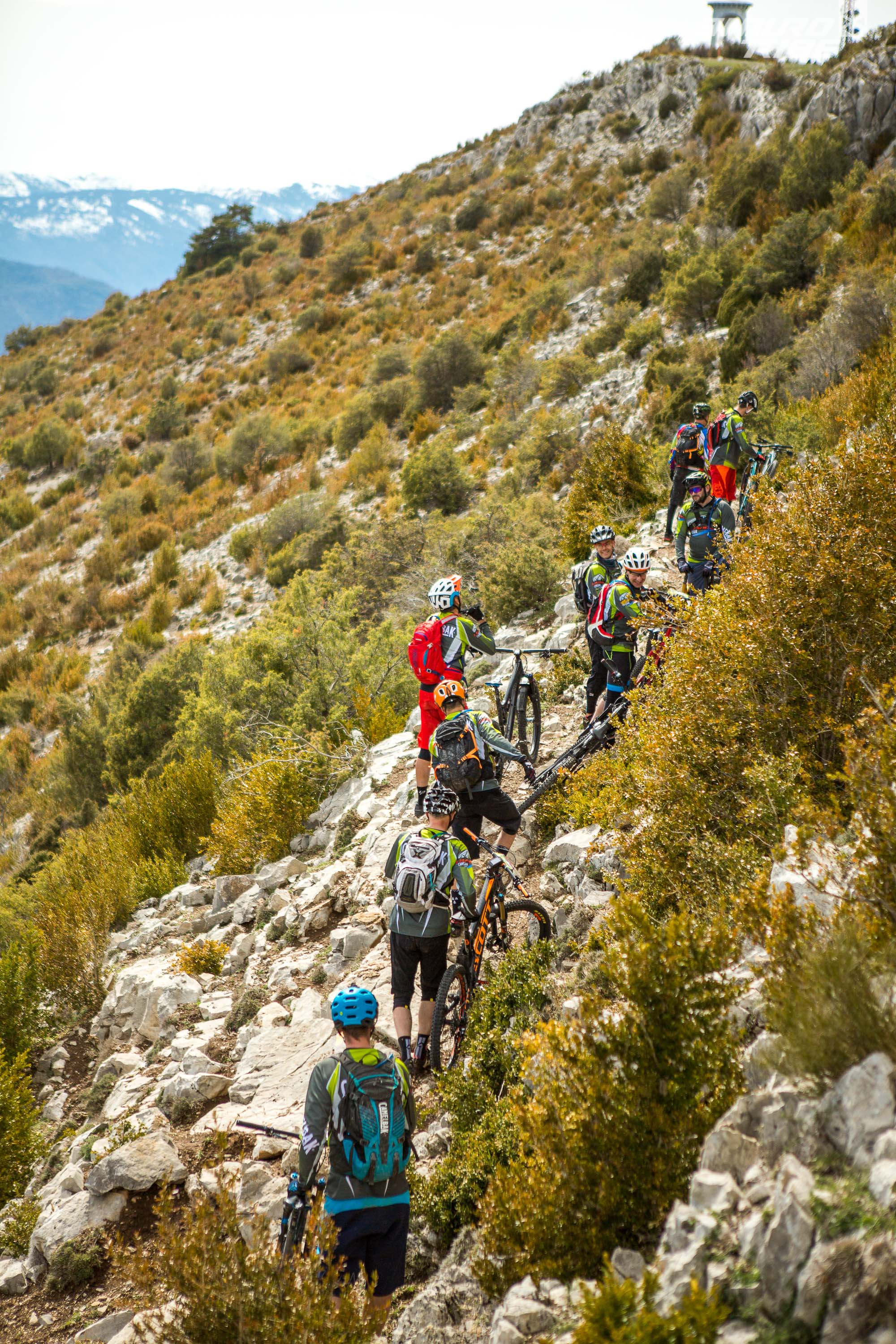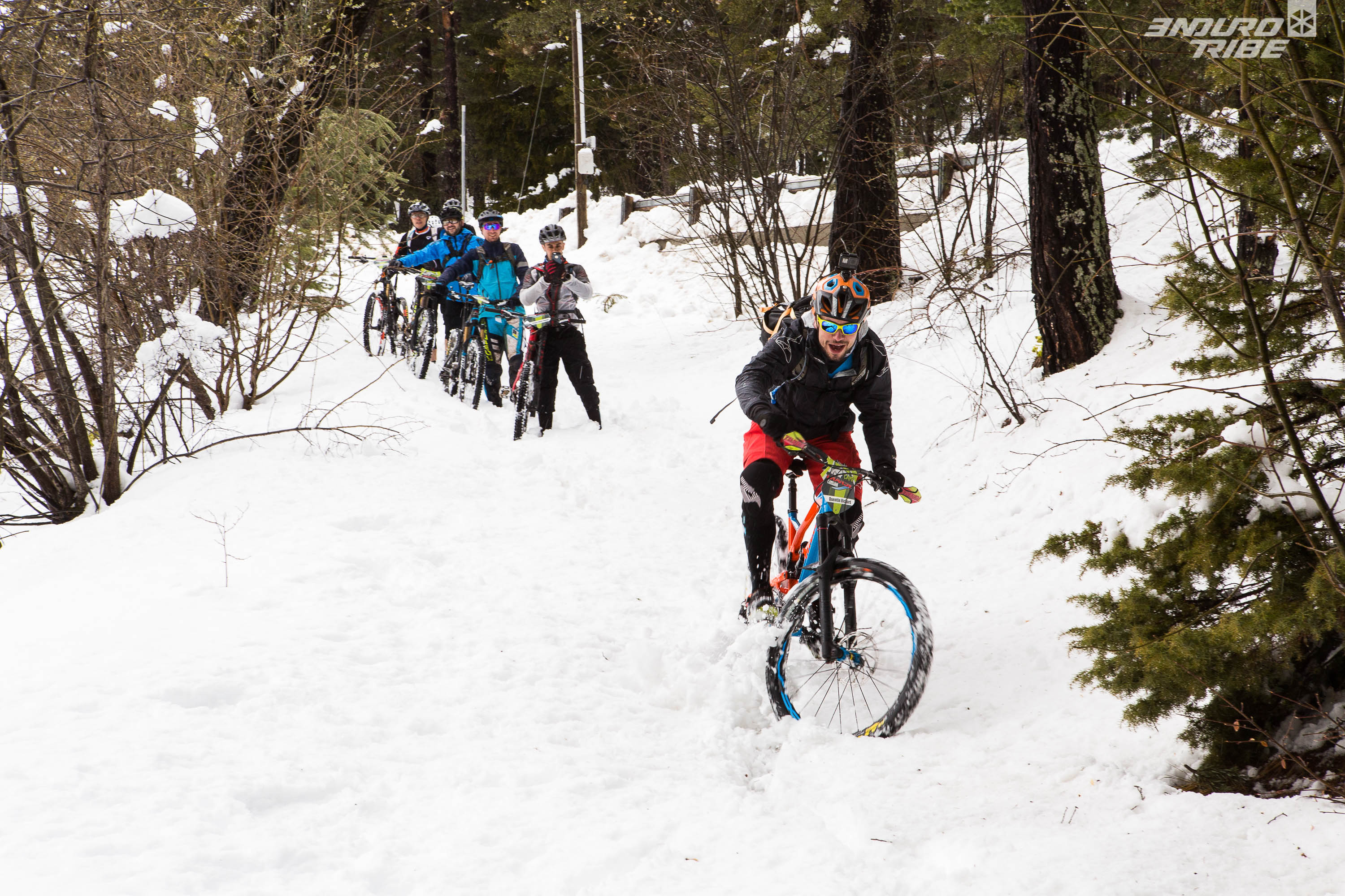 Cinq participants ont répondu à l’appel, aux pratiques majoritairement Rando/Trail/AM, encadrés par un staff UCC conséquent. Tous sont là pour se faire plaisir, passer un bon moment, faire du beau vélo de montagne. On est assez éloigné des pures reconnaissances que l’on pouvait supposer, à vouloir « limer » chaque épingle ou cailloux, optimiser son timing sur telle ou telle section de parcours. Un autre paramètre freine quelques peu les ardeurs, les conditions météo. Annoncée cataclysmique, la météo sera finalement clémente, mais avec en prime une invitée surprise, la neige qui continue de se poser sur les sommets azuréens.