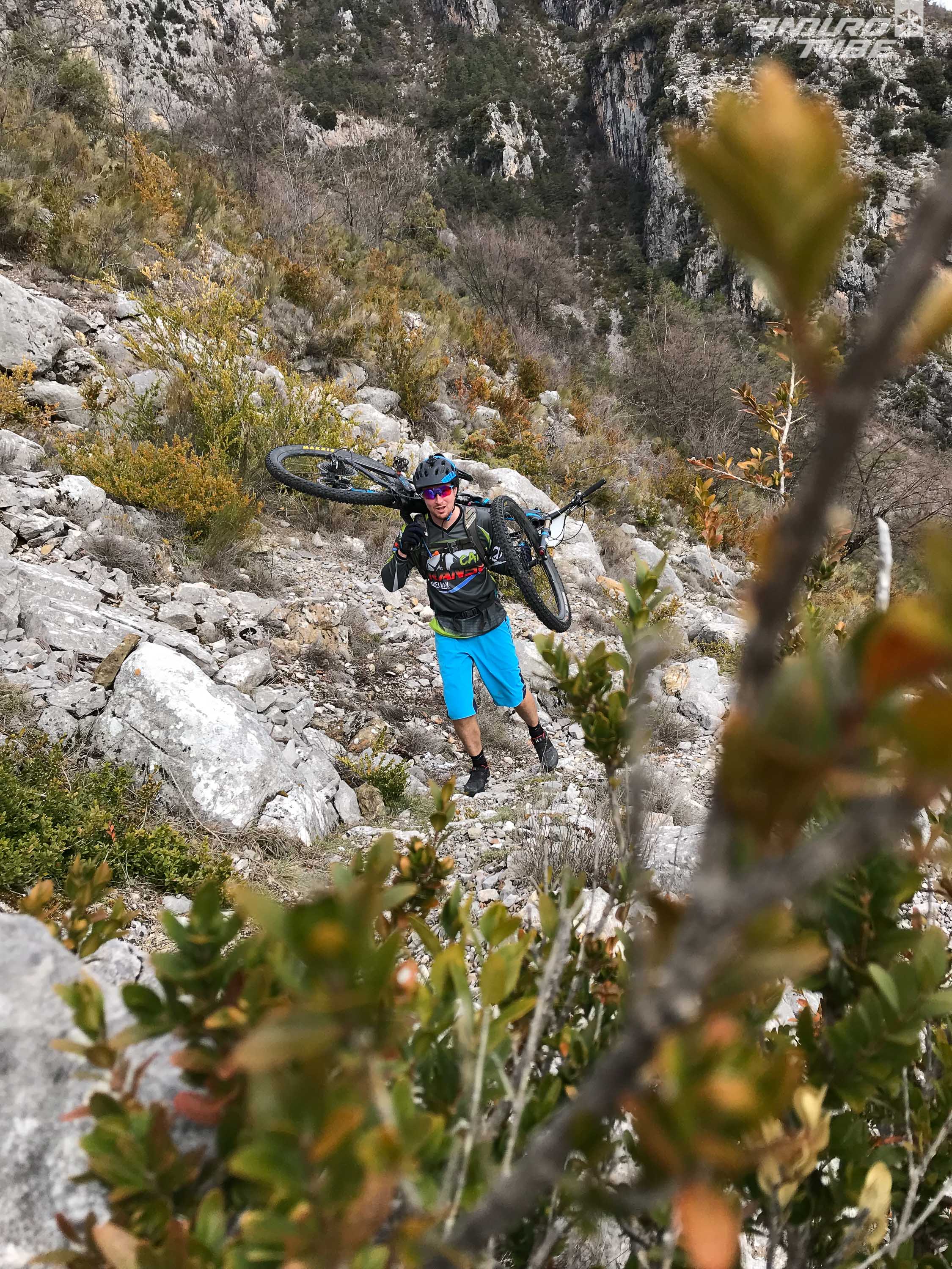 Programme du jour, rallier le fameux Brec d’Utelle via le bas de vallée, roulage puis portage depuis Le Figaret. Un excellent entrainement de prime abord pour ceux qui tenteront l’aventure mi-mai. George Edwards, le père de la TransV, se joint à nous en cette nouvelle journée.