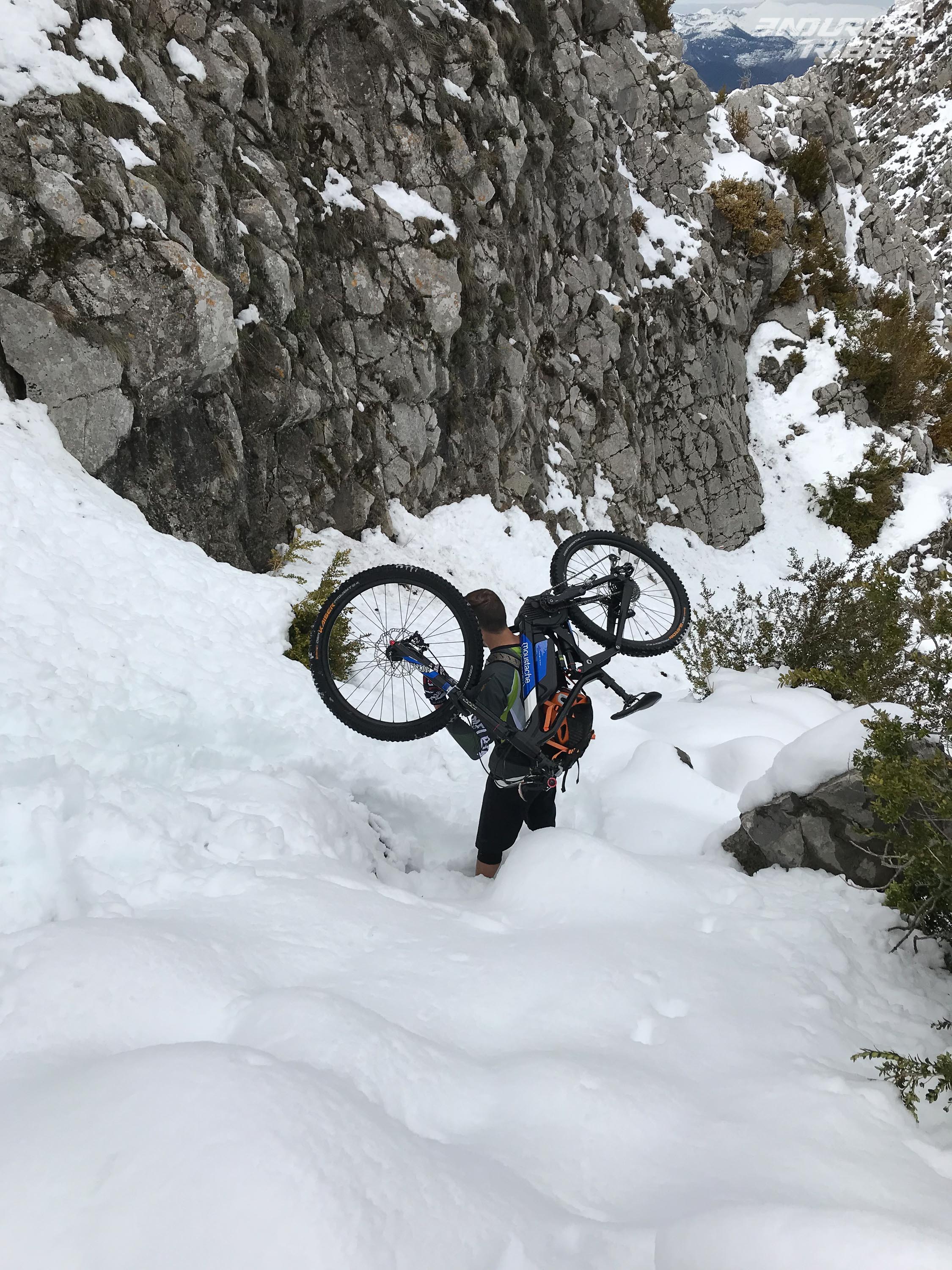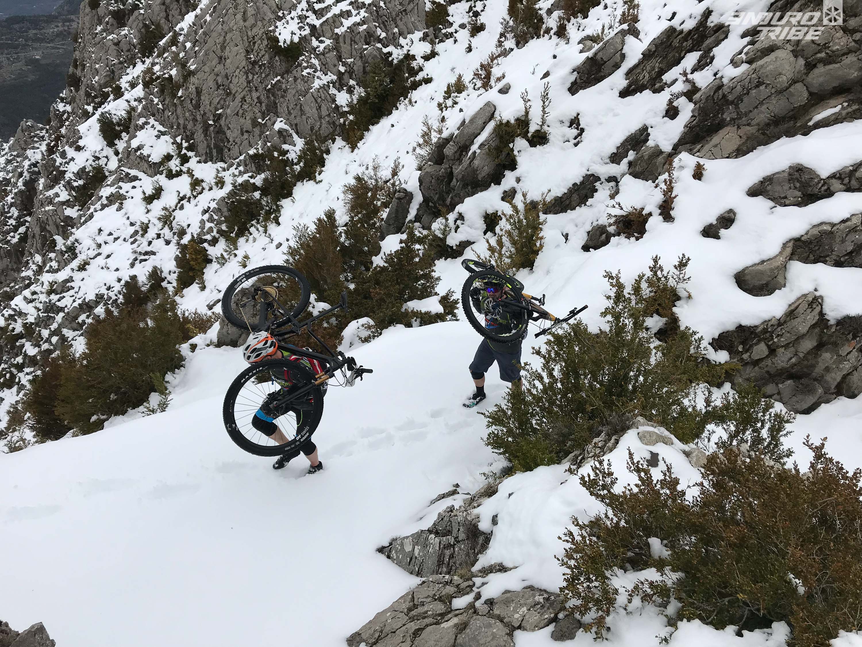 On part en roulant puis rapidement, on pousse, on porte. Les heures défiles, le TransV Camp passe en mode « guerriers ». Un bon 1000m de portage plus loin, dont une bonne moitié à mi-tibias dans la neige, nous voila enfin au Brec. Sacrée ascension, sacrée aventure. De mémoire de locaux, personne n’avait connu pareilles conditions ici et à cette saison. On se demande un peu ce que l’on fout là avec nos VTT, plantés dans 30 à 50cm de neige… Certains du staff, en VTTAE de plus de 24kg, se rappelleront de cette matinée portage.