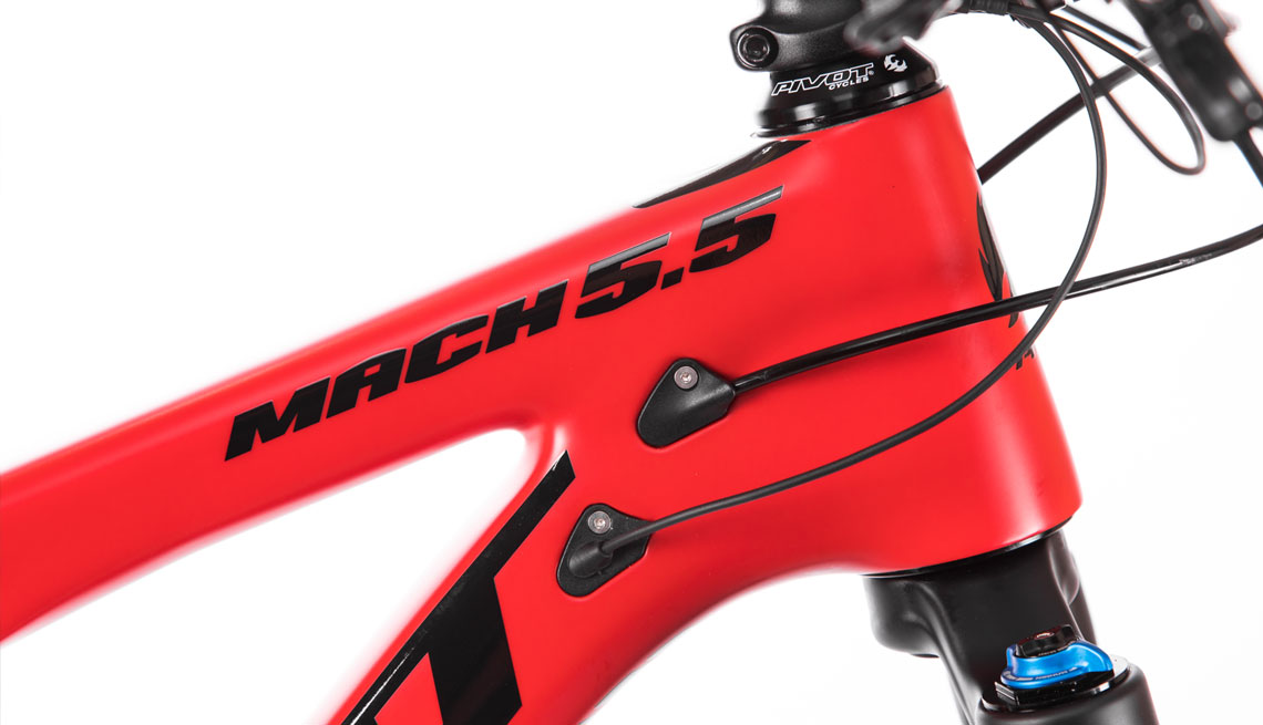 Moulé avec une fibre de carbone HM plus légère, le kit cadre Mach 5.5 est annoncé à 2,35kg (amortisseur compris) tandis que certains montages complets haut de gamme passent sous la barre des 12,2kg avec tige de selle télescopique !