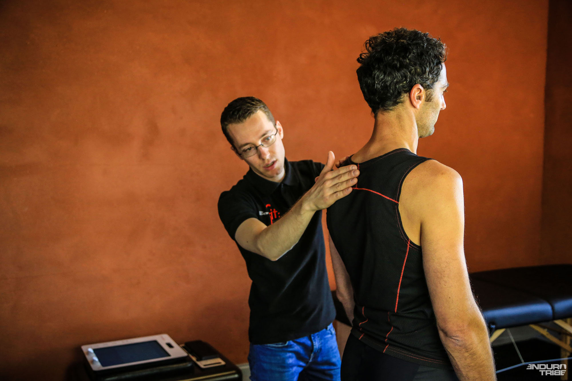 Dans cette dernière optique, et ayant vu passer pas mal de « papiers » au sujet des études posturales, la question de l’optimisation de ma position sur le vélo (qui me trottait dans la tête depuis un bout de temps) est revenue à l’ordre du jour. N’étant pas routier ni crosseur pour un sou, et encore moins adepte des tenues saillantes, un grand nombre de questions restaient pour moi jusque-là en suspens quant à l’utilité d’une étude posturale pour un pratiquant comme moi typé Enduro VTT… !? Il faut bien l’avouer, jusqu’alors complètement profane dans le domaine, les réglages (hauteur de selle, position des cales…) je les faisais au feeling avec plus ou moins de bonnes sensations.