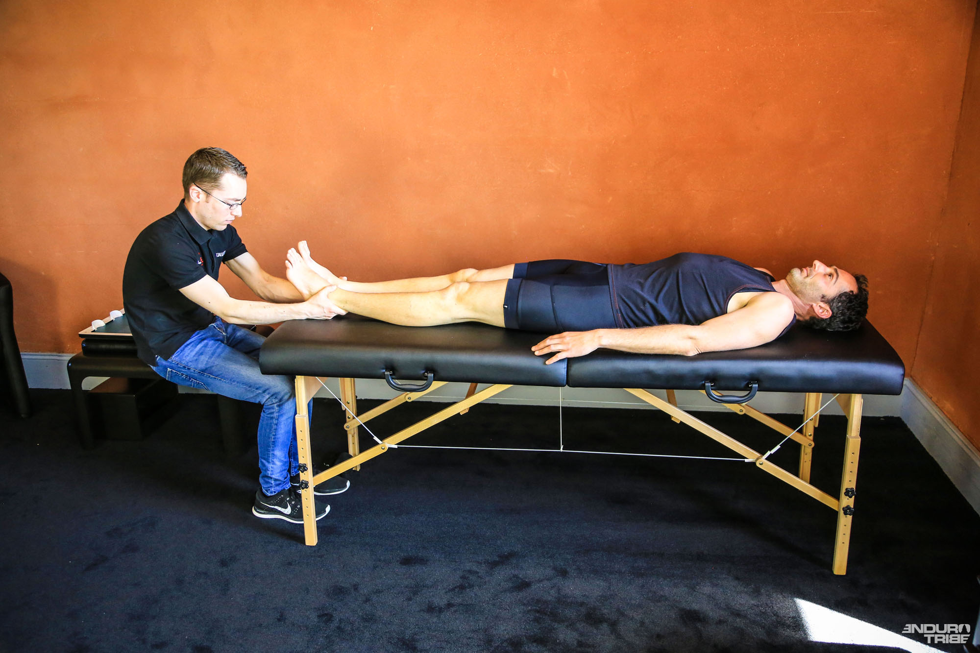 Seconde étape, déterminer l’angulation de l’avant-pied. En position agenouillée sur une table d’ostéopathie, Fabien mesure l’angulation de chaque pied pour déterminer si je suis plutôt varus (vers l’extérieur) ou valgus (vers l’intérieur).
