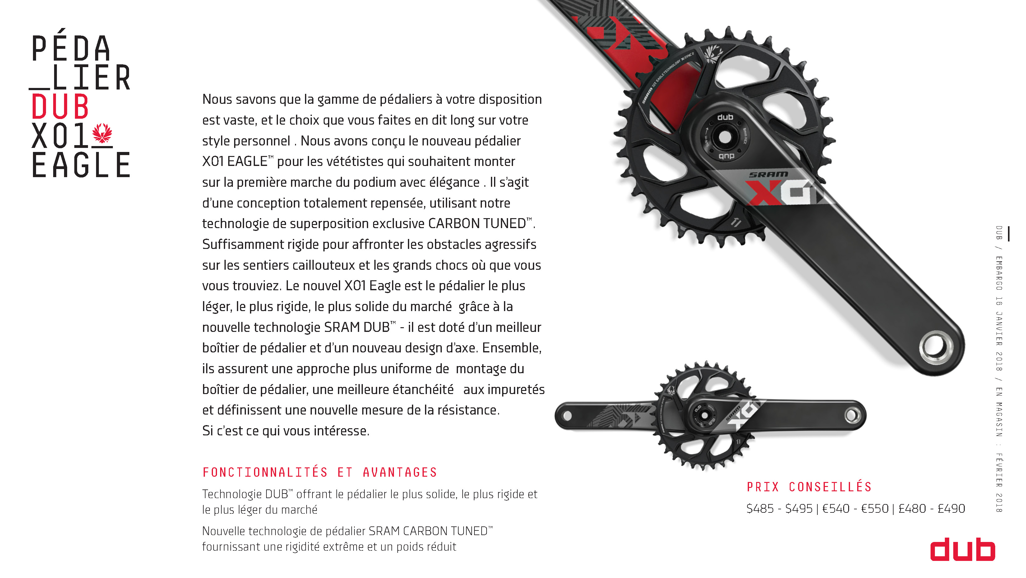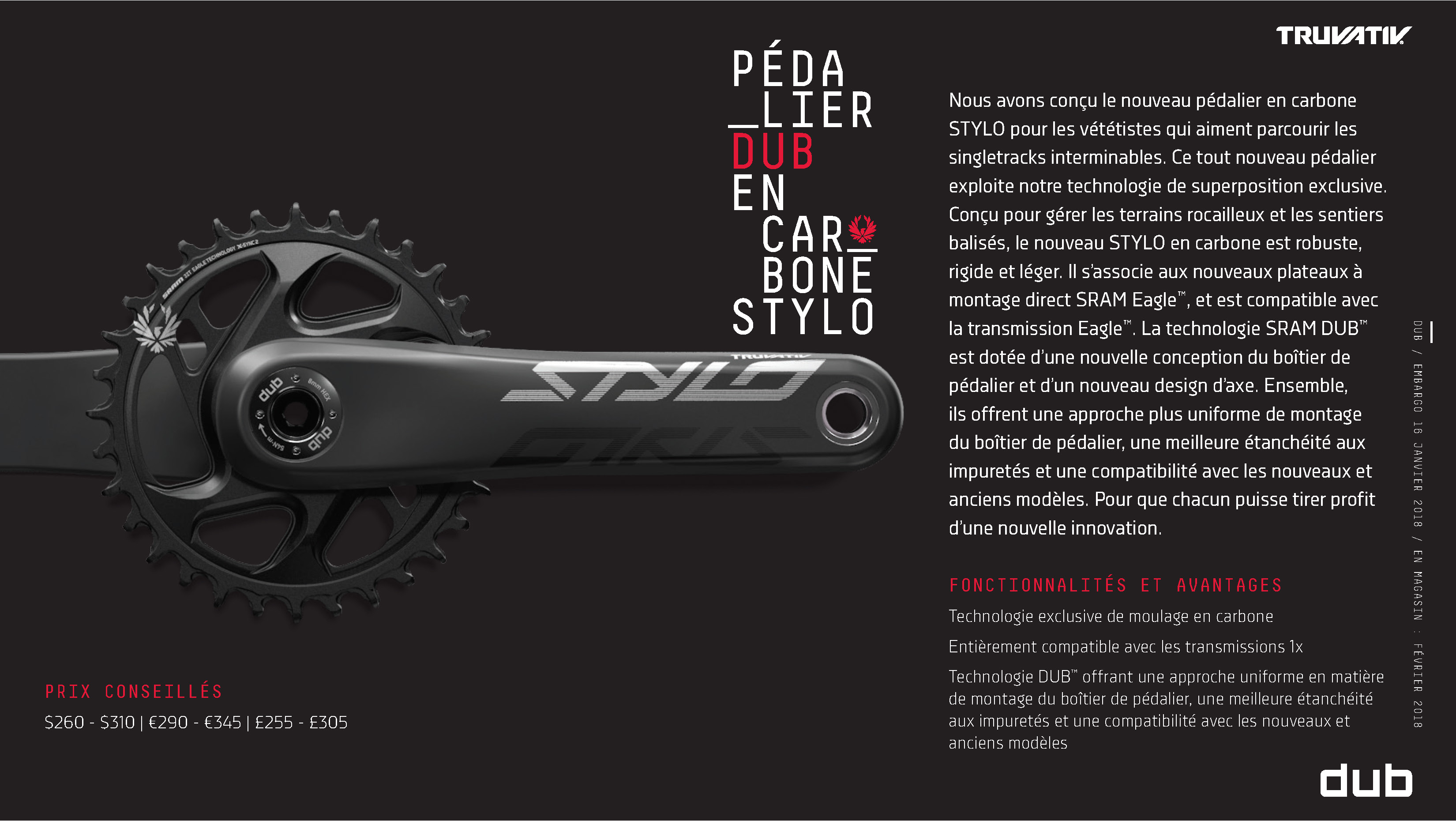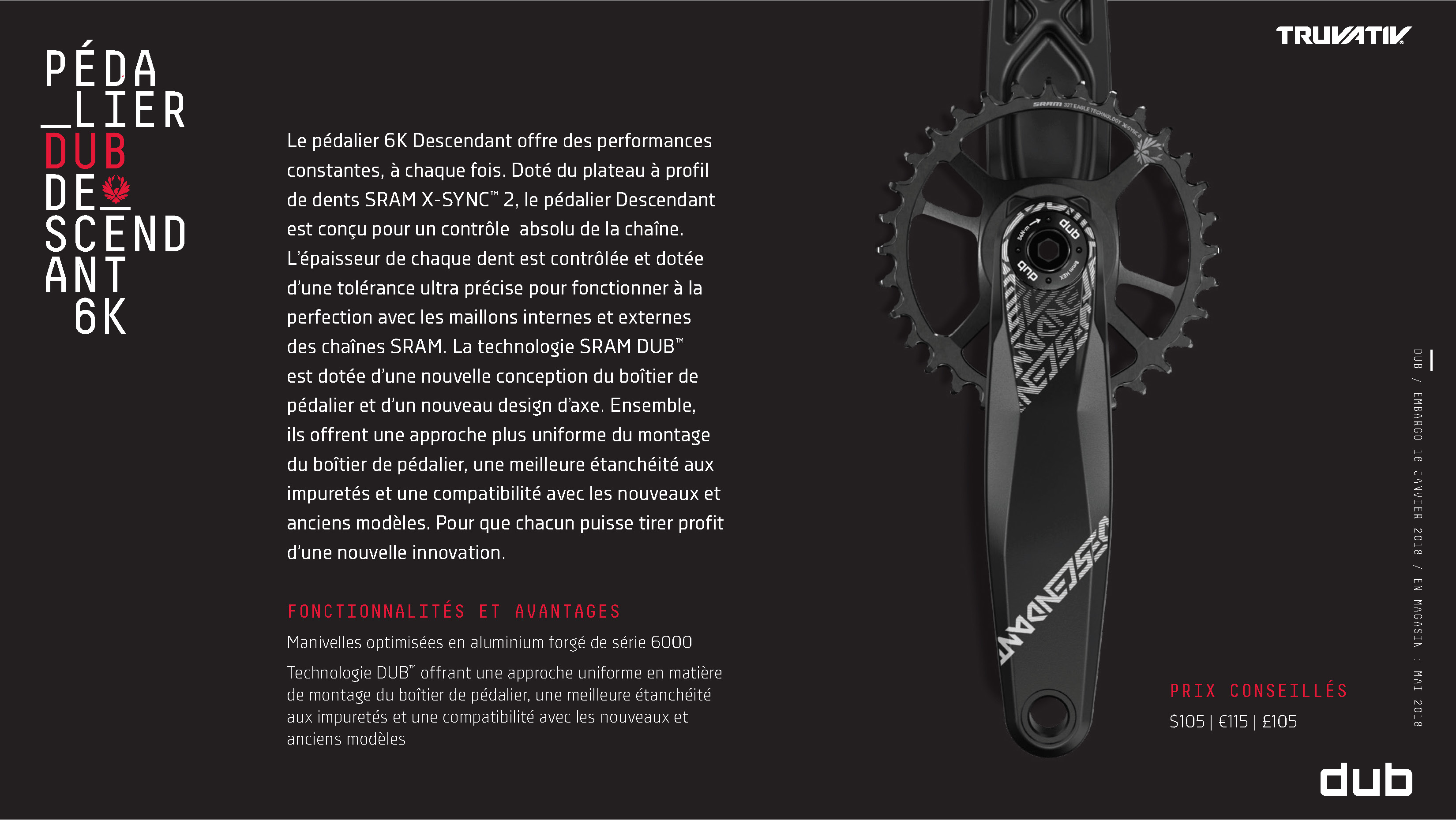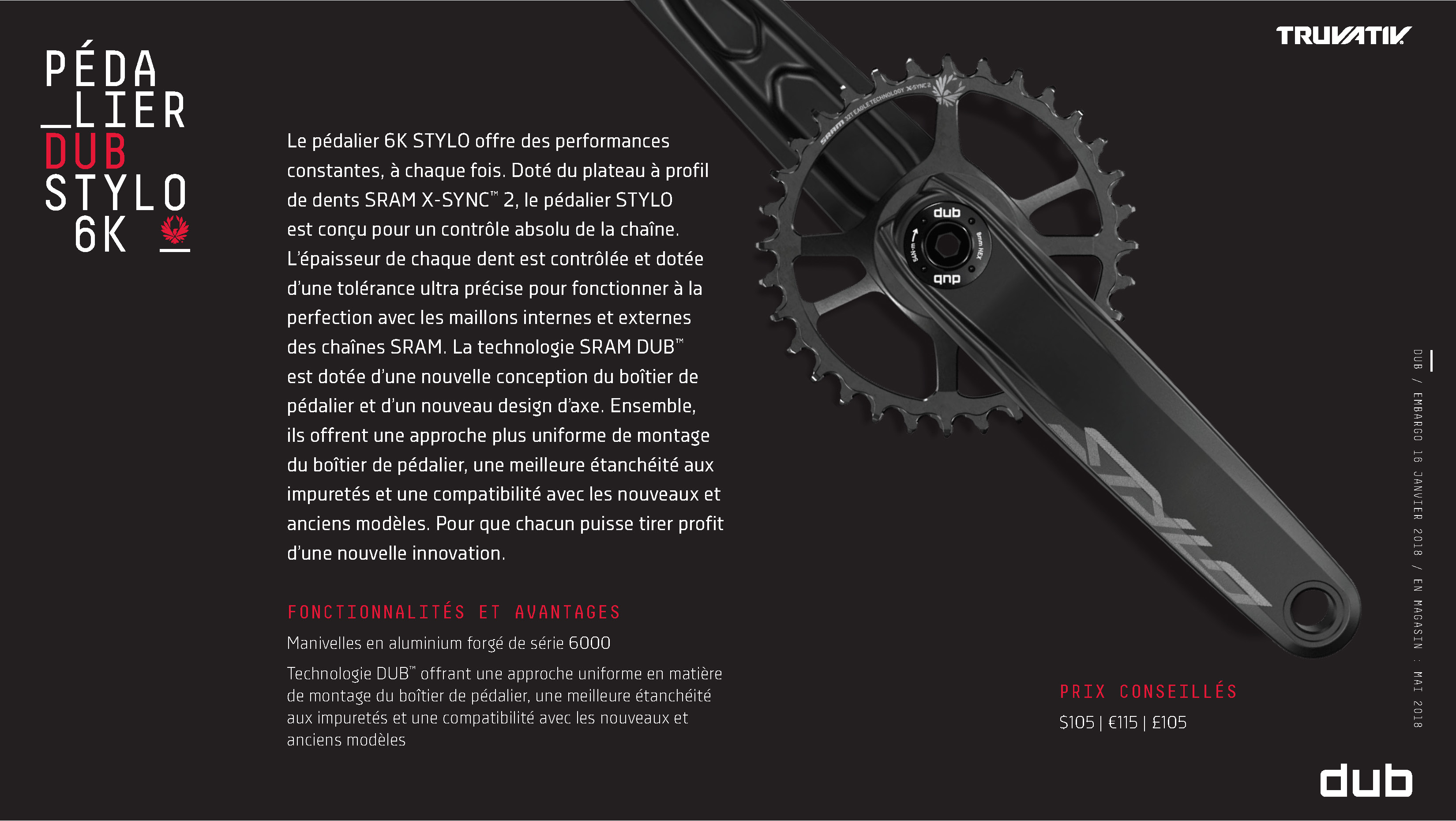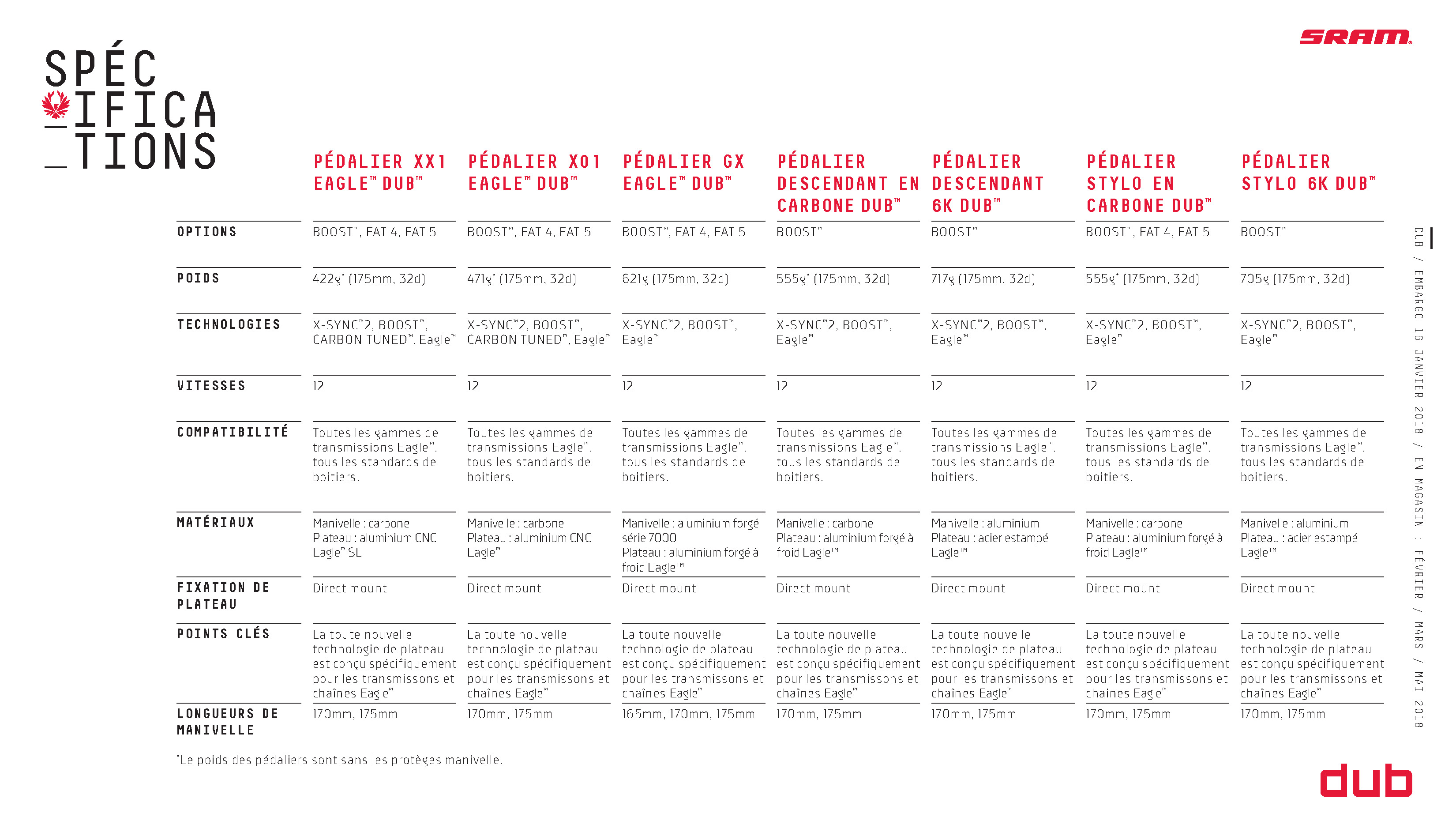 Sur les produits DUB, ce nouvel axe de pédalier est toujours solidaire de la manivelle gauche tandis que le design/la matière évoluent en fonction des déclinaisons de gamme (voir galerie complète ci-après).