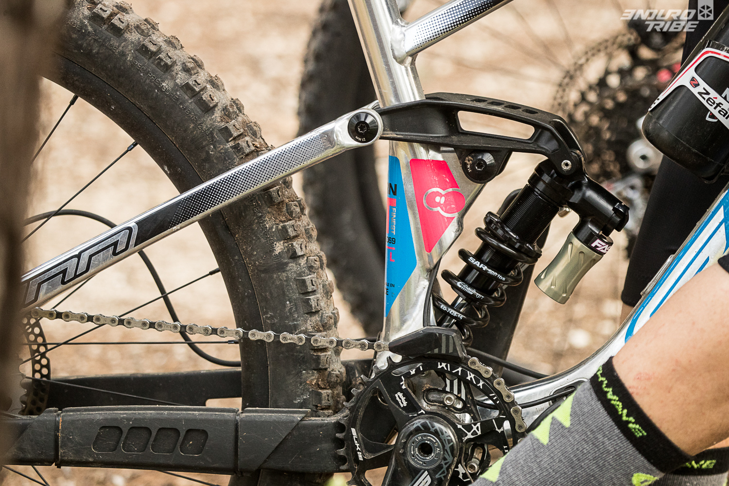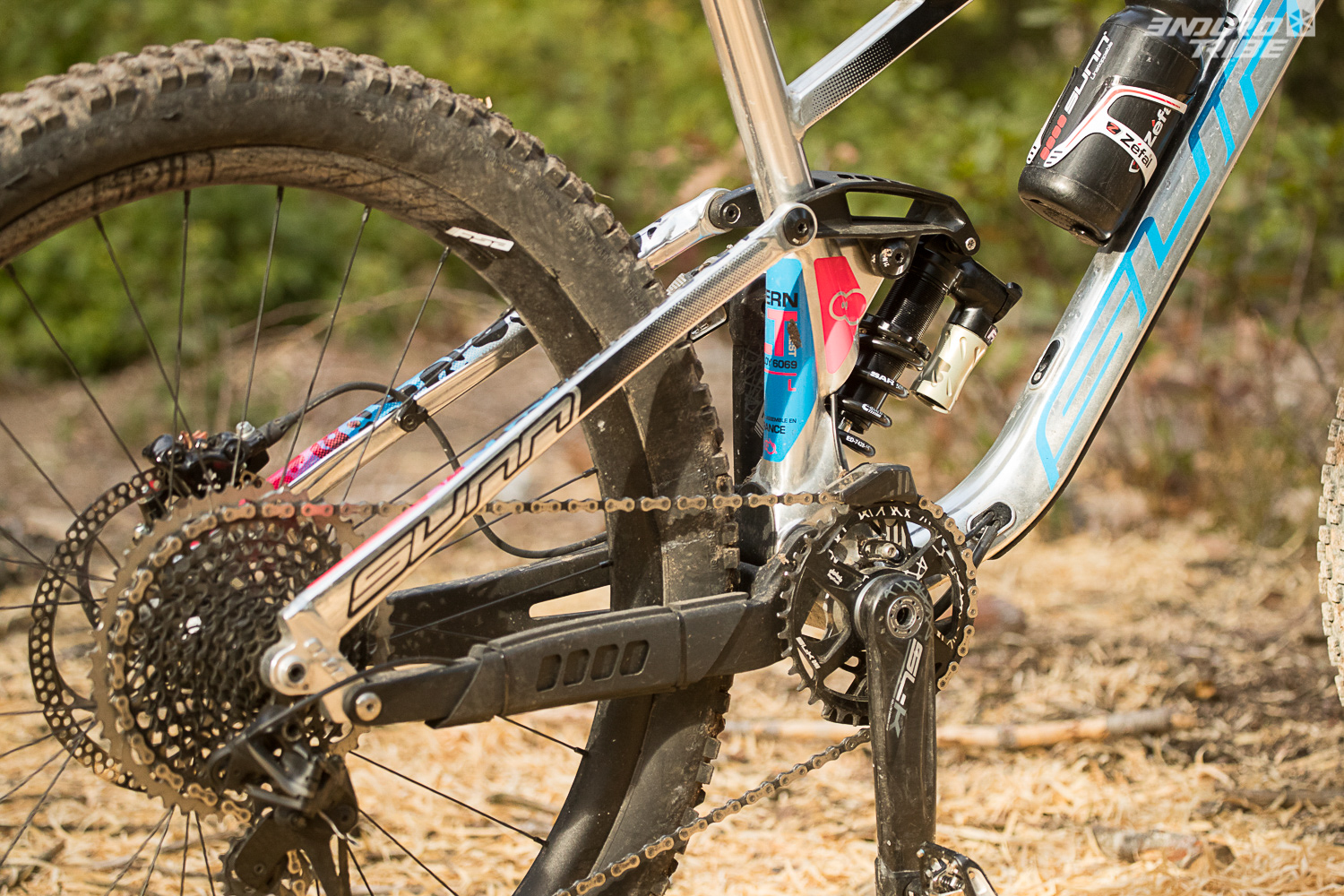 Les pilotes auront à disposition le Kern LT de série, cadre alu (bases en carbone) 27,5 doté de 160mm de débattement, dans sa livrée « Finest » chrome/panthère. En ce nouveau millésime, le Kern LT est passé à la norme d’amortisseur en métrique.