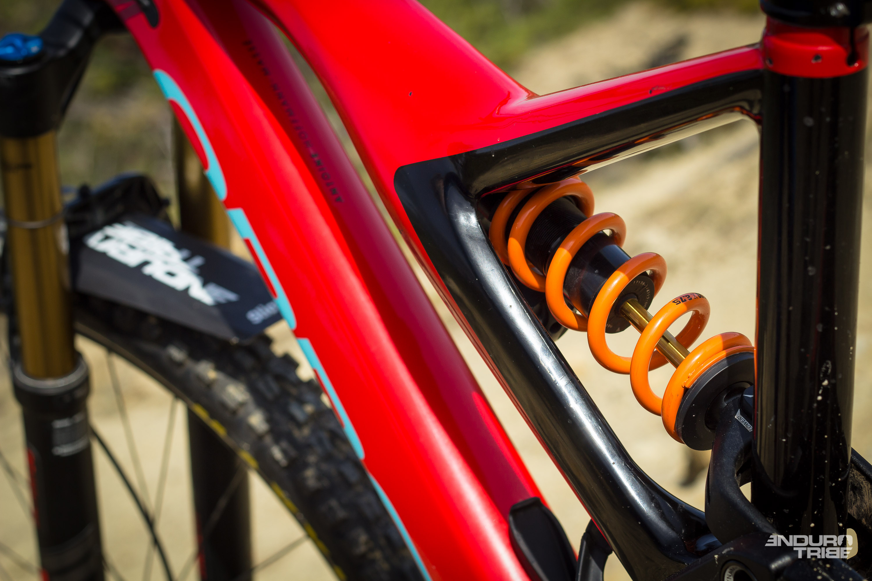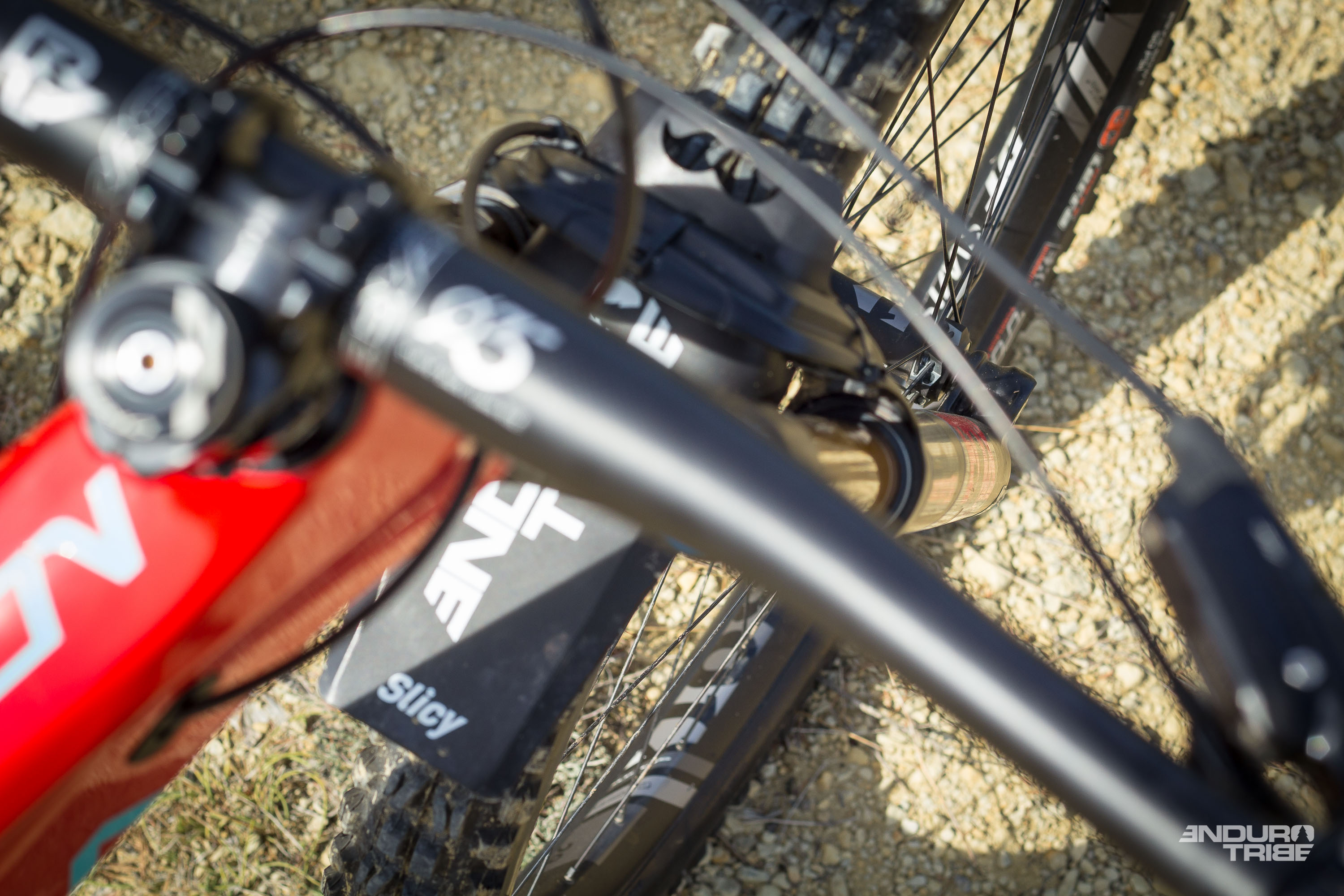Est-ce l’asymétrie et le renfort tube de selle/tube supérieur qui soulage l’amortisseur des contraintes ? Sont-ce les réglages internes de suspension apportés sur chaque amortisseur ? Certainement un peu des deux !