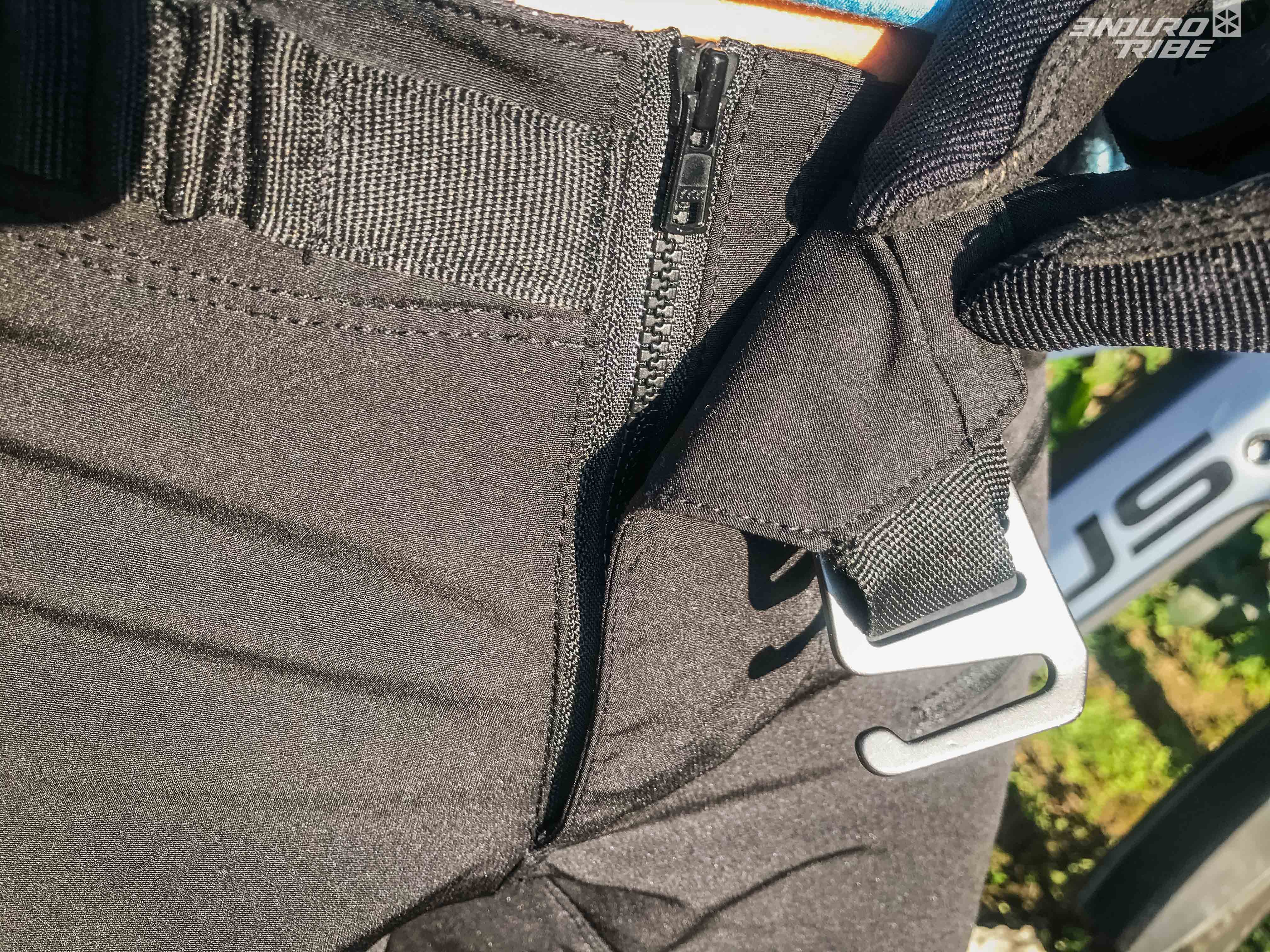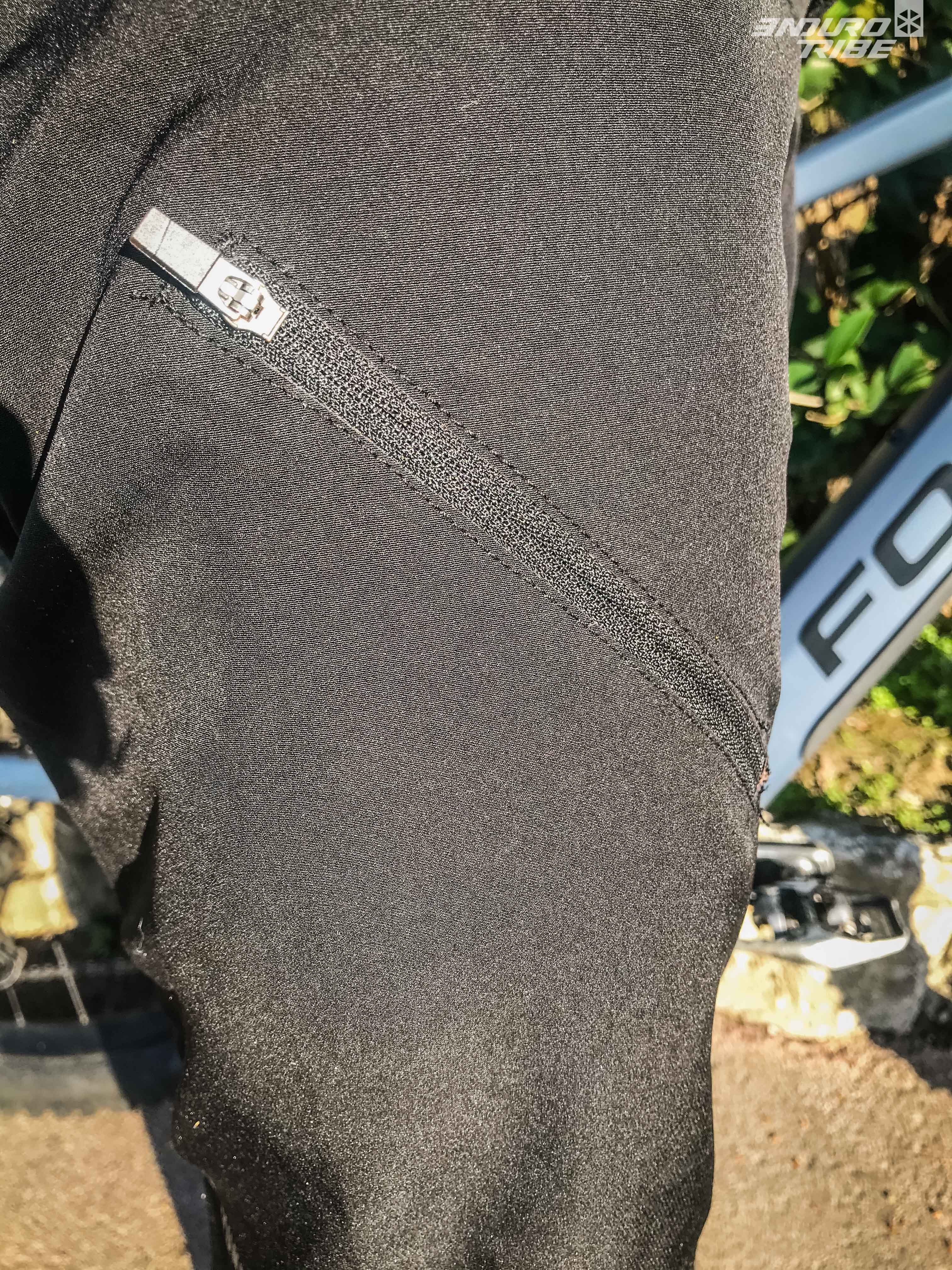 Trois poches zippées complètent ce short. Deux à gauche superposées et un à droite. Elles sont situées sur l’avant des cuisses donc n’exposent « pas trop » le contenu de celles-ci en cas de chute.